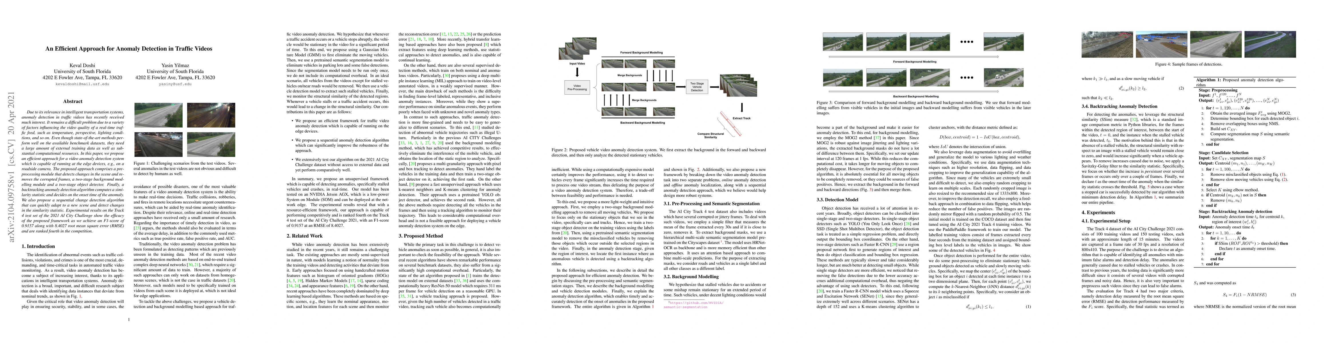 Due to its relevance in intelligent transportation systems, anomaly detection in traffic videos has recently received much interest. It remains a difficult problem due to a variety of factors influencing the video quality of a real-time traffic feed, such as temperature, perspective, lighting conditions, and so on. Even though state-of-the-art methods perform well on the available benchmark datasets, they need a large amount of external training data as well as substantial computational resources. In this paper, we propose an efficient approach for a video anomaly detection system which is capable of running at the edge devices, e.g., on a roadside camera. The proposed approach comprises a pre-processing module that detects changes in the scene and removes the corrupted frames, a two-stage background modelling module and a two-stage object detector. Finally, a backtracking anomaly detection algorithm computes a similarity statistic and decides on the onset time of the anomaly. We also propose a sequential change detection algorithm that can quickly adapt to a new scene and detect changes in the similarity statistic. Experimental results on the Track 4 test set of the 2021 AI City Challenge show the efficacy of the proposed framework as we achieve an F1-score of 0.9157 along with 8.4027 root mean square error (RMSE) and are ranked fourth in the competition.