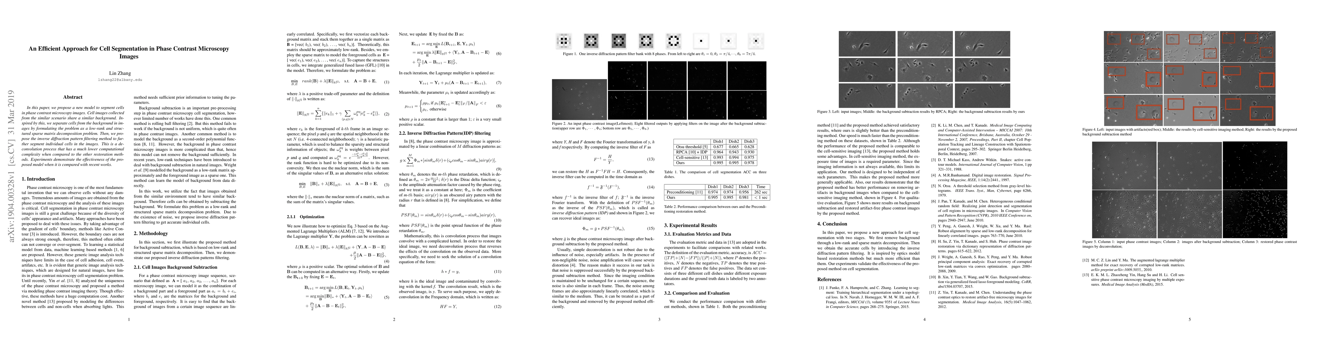 A new model segments cells from background in phase contrast microscopy images using low-rank sparse matrix decomposition and inverse diffraction pattern filtering, demonstrating effectiveness over recent works.