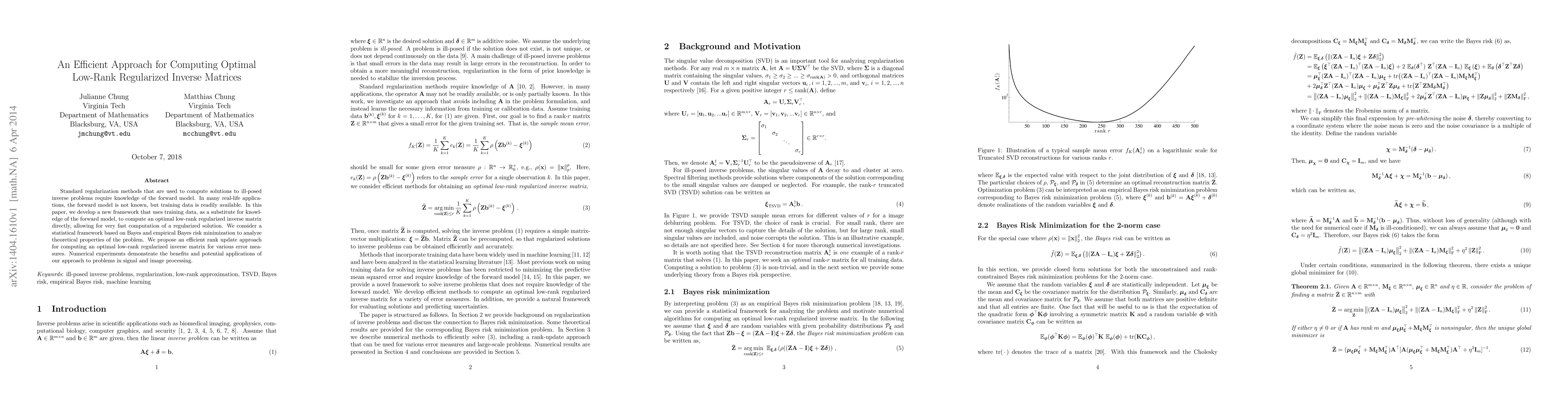 This paper introduces a novel framework to compute optimal low-rank regularized inverse matrices using training data instead of a known forward model, enabling rapid computation for ill-posed inverse problems. The approach employs a statistical framework based on Bayes and empirical Bayes risk minimization, and numerical experiments show its effectiveness in signal and image processing.