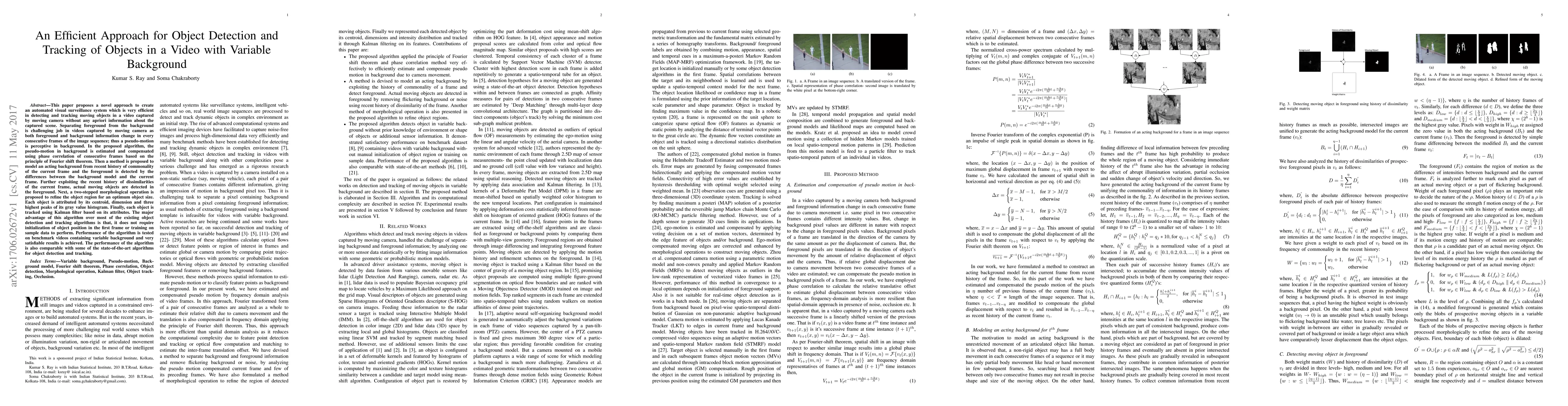 This paper proposes a novel approach to create an automated visual surveillance system which is very efficient in detecting and tracking moving objects in a video captured by moving camera without any apriori information about the captured scene. Separating foreground from the background is challenging job in videos captured by moving camera as both foreground and background information change in every consecutive frames of the image sequence; thus a pseudo-motion is perceptive in background. In the proposed algorithm, the pseudo-motion in background is estimated and compensated using phase correlation of consecutive frames based on the principle of Fourier shift theorem. Then a method is proposed to model an acting background from recent history of commonality of the current frame and the foreground is detected by the differences between the background model and the current frame. Further exploiting the recent history of dissimilarities of the current frame, actual moving objects are detected in the foreground. Next, a two-stepped morphological operation is proposed to refine the object region for an optimum object size. Each object is attributed by its centroid, dimension and three highest peaks of its gray value histogram. Finally, each object is tracked using Kalman filter based on its attributes. The major advantage of this algorithm over most of the existing object detection and tracking algorithms is that, it does not require initialization of object position in the first frame or training on sample data to perform. Performance of the algorithm is tested on benchmark videos containing variable background and very satisfiable results is achieved. The performance of the algorithm is also comparable with some of the state-of-the-art algorithms for object detection and tracking.
