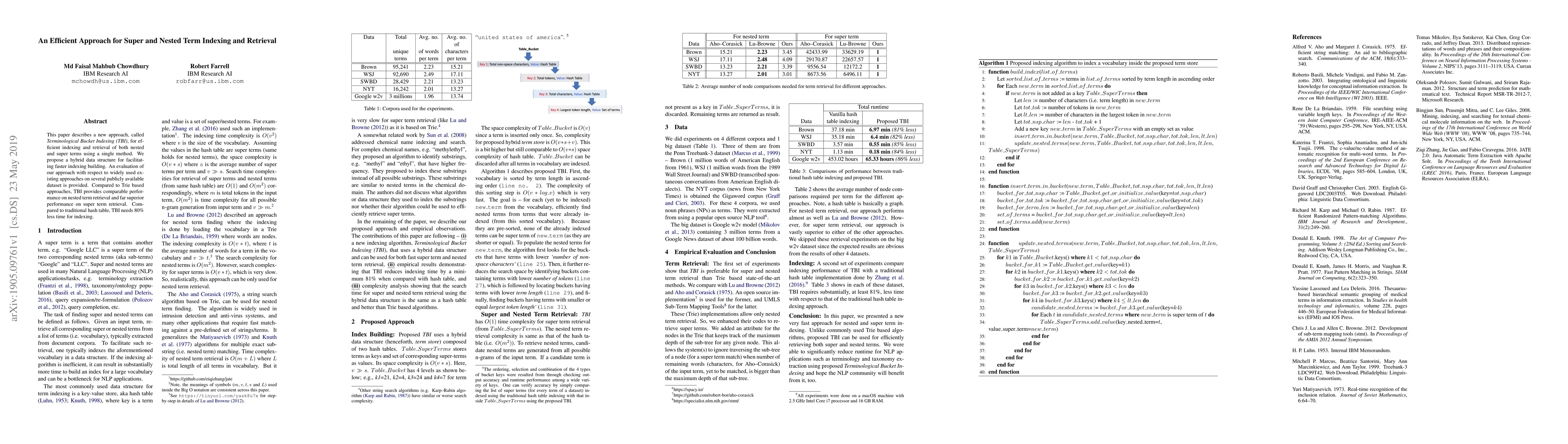 This paper introduces Terminological Bucket Indexing (TBI), a hybrid data structure for efficient indexing and retrieval of nested and super terms, outperforming traditional methods in both indexing speed and super term retrieval. TBI achieves comparable nested term retrieval performance to Trie-based approaches while requiring 80% less time for indexing compared to hash tables.