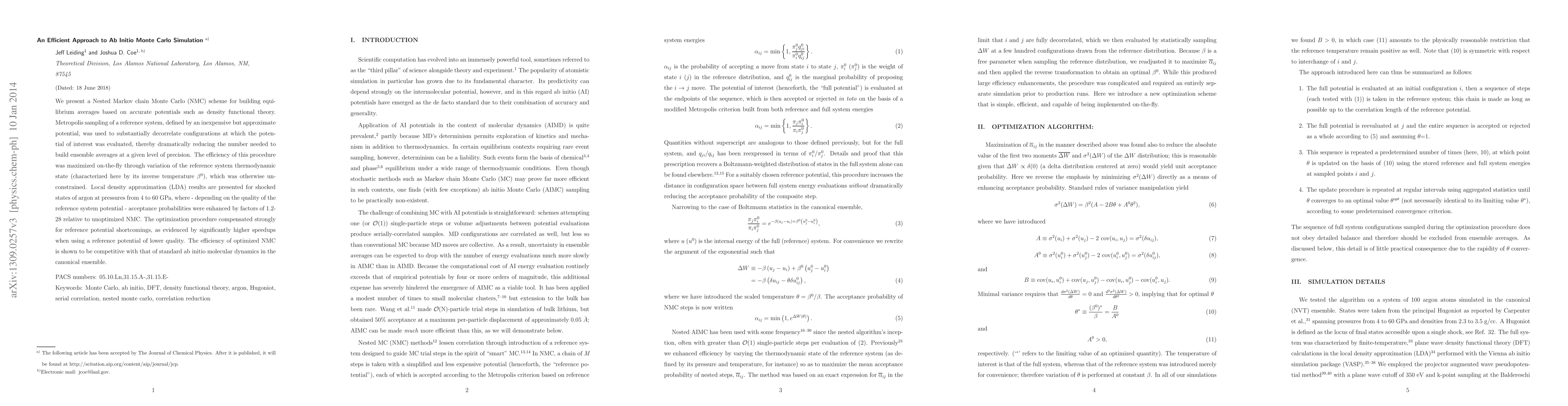 Researchers developed a new method for simulating materials using ab initio Monte Carlo simulations, which significantly reduces computational time by using inexpensive but approximate potentials as references. This approach is competitive with existing methods in terms of efficiency.