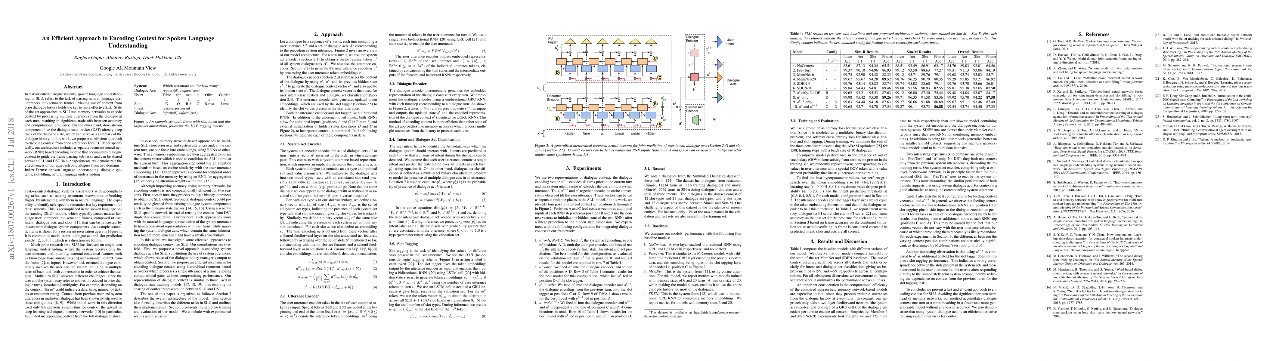 This paper proposes an efficient context encoding approach for spoken language understanding in dialogue systems, utilizing a separate RNN module to accumulate dialogue context and guide frame parsing, achieving a balance between accuracy and computational efficiency. The method is shown to be effective in two different dialogue domains.