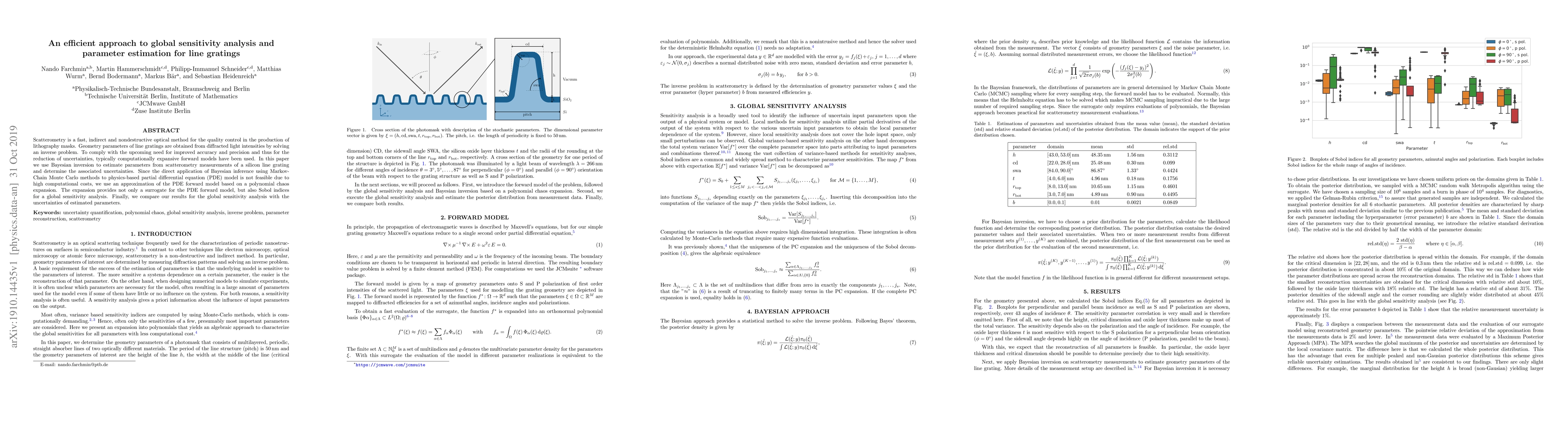 This paper proposes a Bayesian inversion method using polynomial chaos expansion to efficiently estimate parameters and uncertainties in scatterometry measurements for silicon line gratings, replacing computationally intensive forward models with a surrogate model for global sensitivity analysis. The approach combines reduced computational cost with accurate parameter estimation and uncertainty quantification.