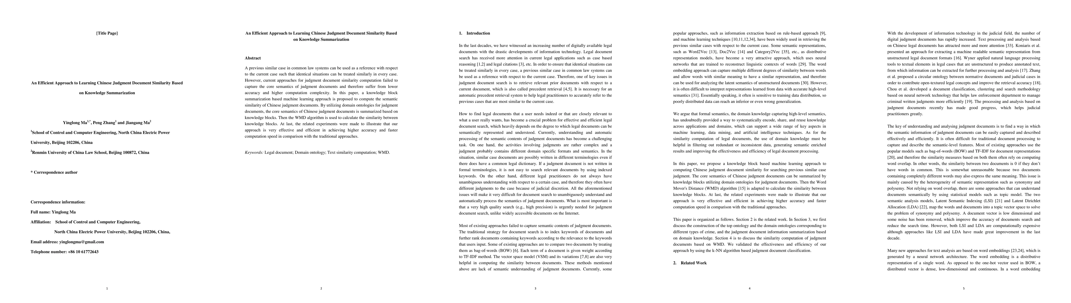 This paper proposes a machine learning method for computing the semantic similarity of Chinese judgment documents using knowledge block summarization. It utilizes domain ontologies to capture core semantics, employing the WMD algorithm for similarity calculation, and demonstrates improved accuracy and efficiency over traditional methods.