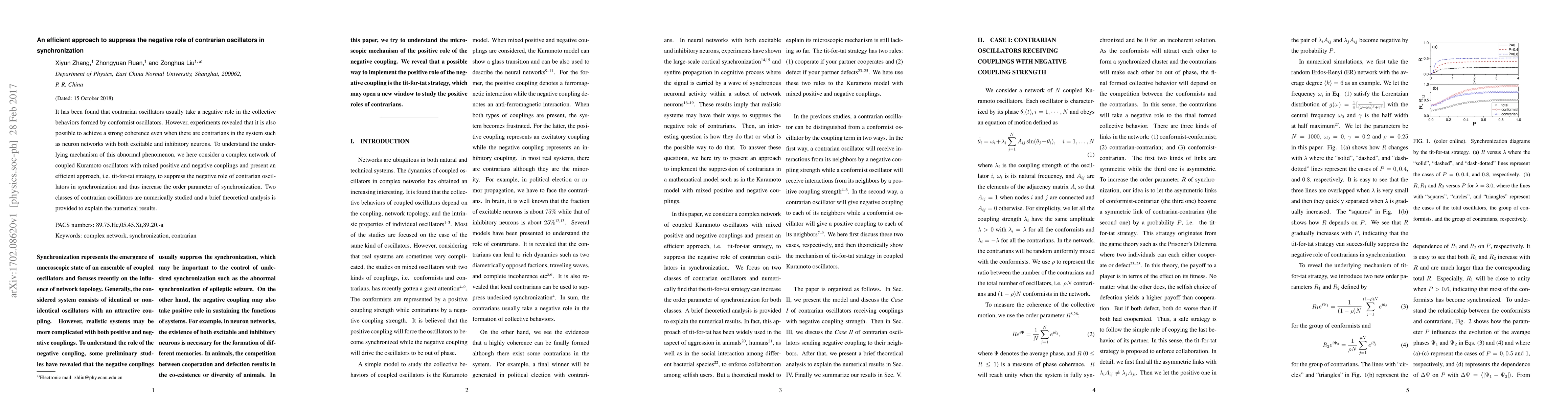 It has been found that contrarian oscillators usually take a negative role in the collective behaviors formed by conformist oscillators. However, experiments revealed that it is also possible to achieve a strong coherence even when there are contrarians in the system such as neuron networks with both excitable and inhibitory neurons. To understand the underlying mechanism of this abnormal phenomenon, we here consider a complex network of coupled Kuramoto oscillators with mixed positive and negative couplings and present an efficient approach, i.e. tit-for-tat strategy, to suppress the negative role of contrarian oscillators in synchronization and thus increase the order parameter of synchronization. Two classes of contrarian oscillators are numerically studied and a brief theoretical analysis is provided to explain the numerical results.