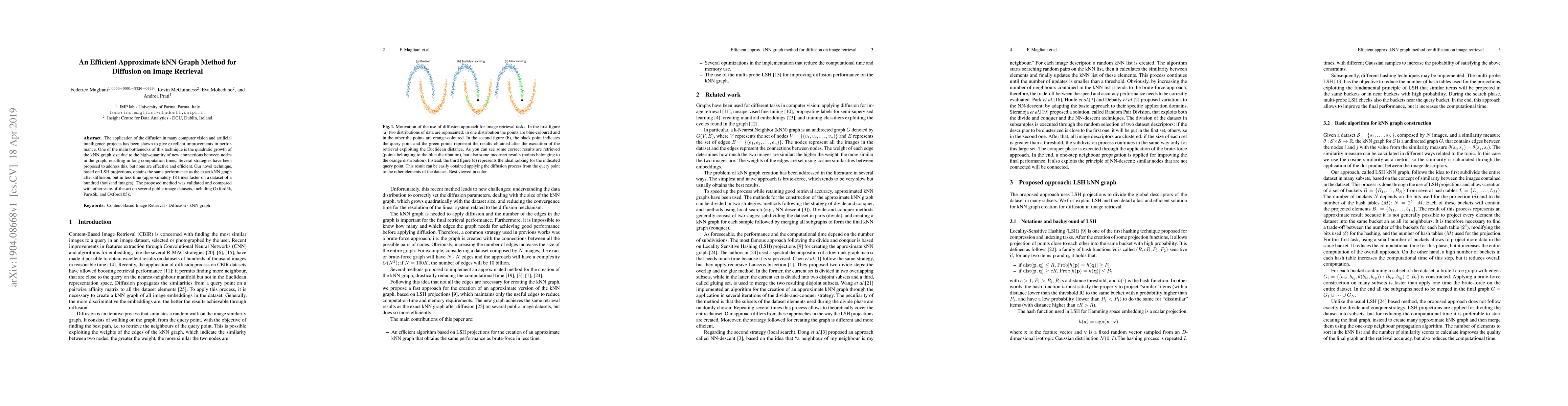 This paper proposes an efficient approximate kNN graph method using LSH projections for diffusion-based image retrieval, achieving approximately 18 times faster performance compared to exact kNN graph methods while maintaining similar retrieval accuracy. The method was validated against state-of-the-art techniques on multiple public datasets.