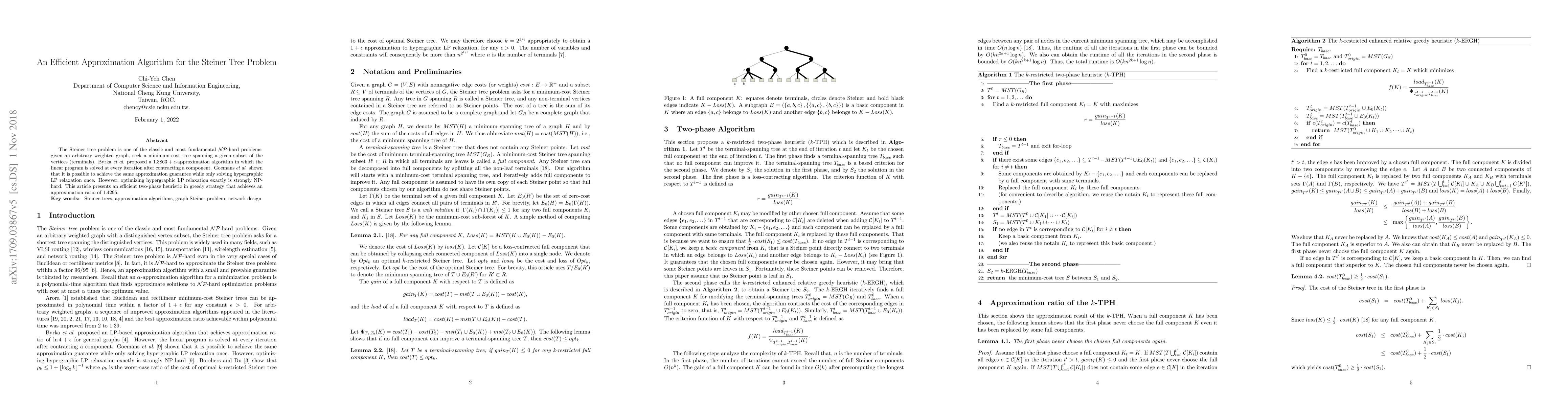 This paper introduces an efficient two-phase heuristic for the Steiner tree problem, achieving a $1.4295$ approximation ratio. It compares to previous algorithms by solving a hypergraphic LP relaxation only once, contrasting with iterative LP solutions.