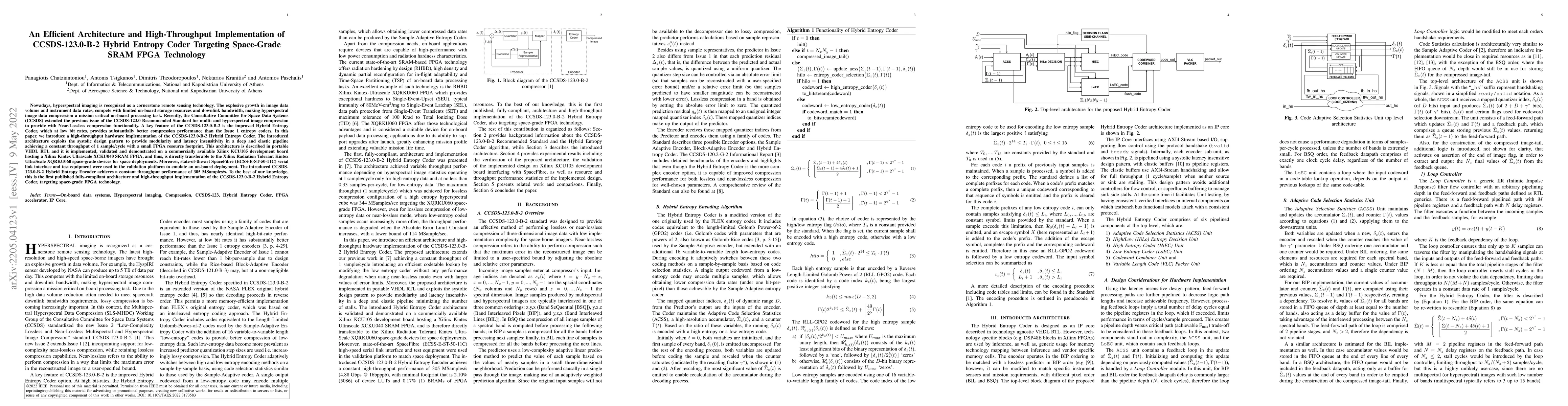 Nowadays, hyperspectral imaging is recognized as cornerstone remote sensing technology. The explosive growth in image data volume and instrument data rates, compete with limited on-board storage resources and downlink bandwidth, making hyperspectral image data compression a mission critical on-board processing task. The Consultative Committee for Space Data Systems (CCSDS) extended the previous issue of the CCSDS-123.0 Recommended Standard for multi- and hyperspectral image compression to provide with Near-Lossless compression functionality. A key feature of the CCSDS-123.0-B-2 is the improved Hybrid Entropy Coder, which at low bit rates, provides substantially better compression performance than the Issue 1 entropy coders. In this paper, we introduce a high-throughput hardware implementation of the CCSDS-123.0-B-2 Hybrid Entropy Coder. The introduced architecture exploits the systolic design pattern to provide modularity and latency insensitivity in a deep and elastic pipeline achieving a constant throughput of 1 sample/cycle with a small FPGA resource footprint. This architecture is described in portable VHDL RTL and is implemented, validated and demonstrated on a commercially available Xilinx KCU105 development board hosting a Xilinx Kintex Ultrascale XCKU040 SRAM FPGA, and thus, is directly transferable to Xilinx Radiation Tolerant Kintex UltraScale XQRKU060 space-grade devices for space deployments. Moreover, state-of-the-art SpaceFibre (ECSS-E-ST-50-11C) serial link interface and test equipment were used in the validation platform to emulate an on-board deployment. The introduced CCSDS-123.0-B-2 Hybrid Entropy Encoder achieves a constant throughput performance of 305 MSamples/s. To the best of our knowledge, this is the first published fully-compliant architecture and high-throughput implementation of the CCSDS-123.0-B-2 Hybrid Entropy Coder, targeting space-grade FPGA technology.