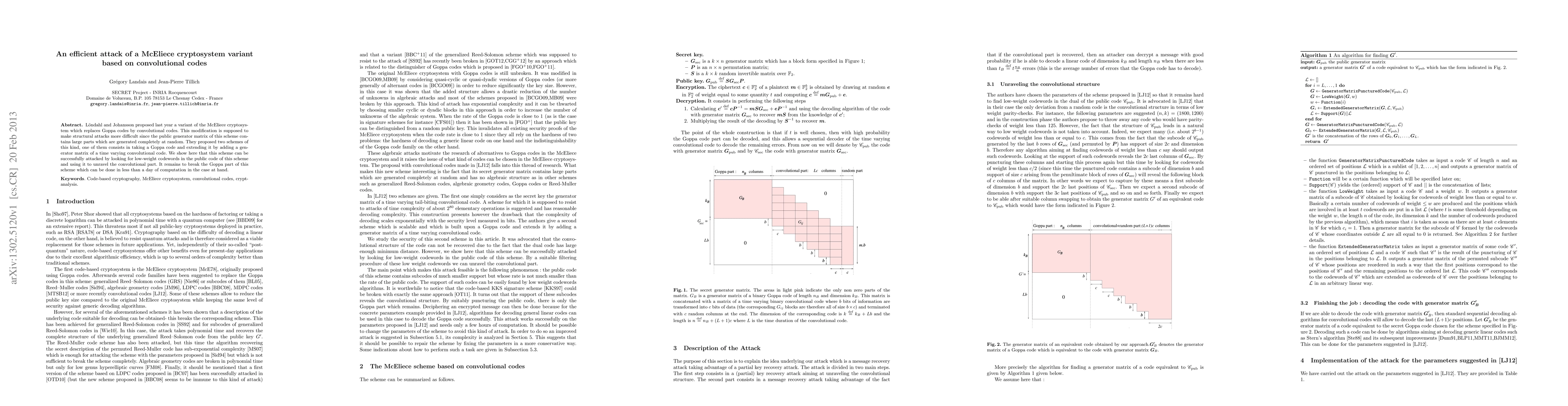 Researchers successfully attacked a modified McEliece cryptosystem variant based on convolutional codes by finding low-weight codewords in the public code, allowing them to unravel the convolutional part and break the scheme in under a day of computation.