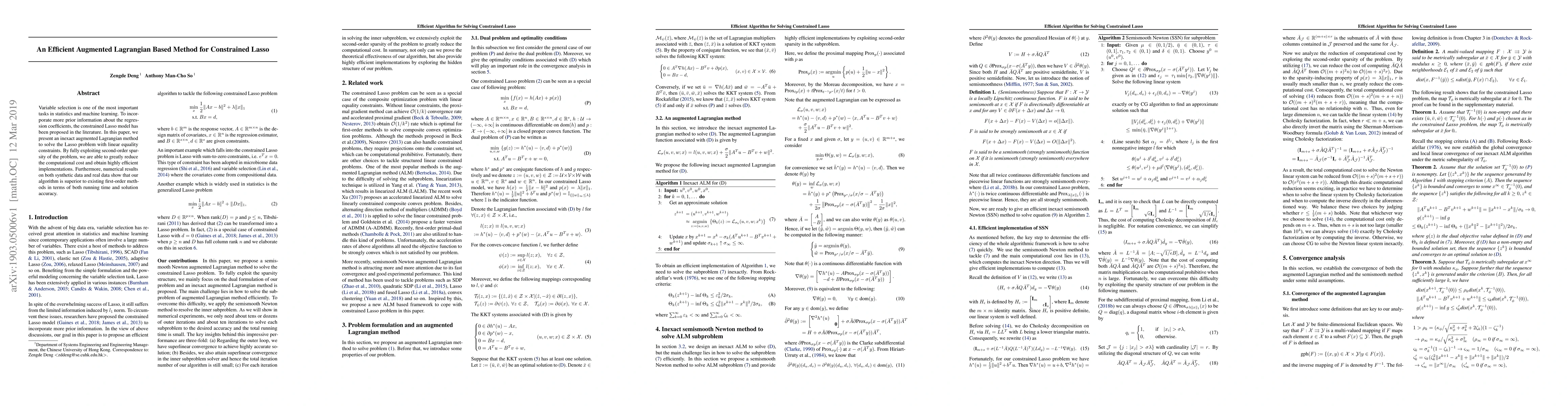 This paper proposes an efficient augmented Lagrangian method for solving the constrained Lasso problem with linear equality constraints, leveraging second-order sparsity to reduce computational cost. The method outperforms existing first-order approaches in both running time and solution accuracy, as demonstrated by numerical results on synthetic and real datasets.
