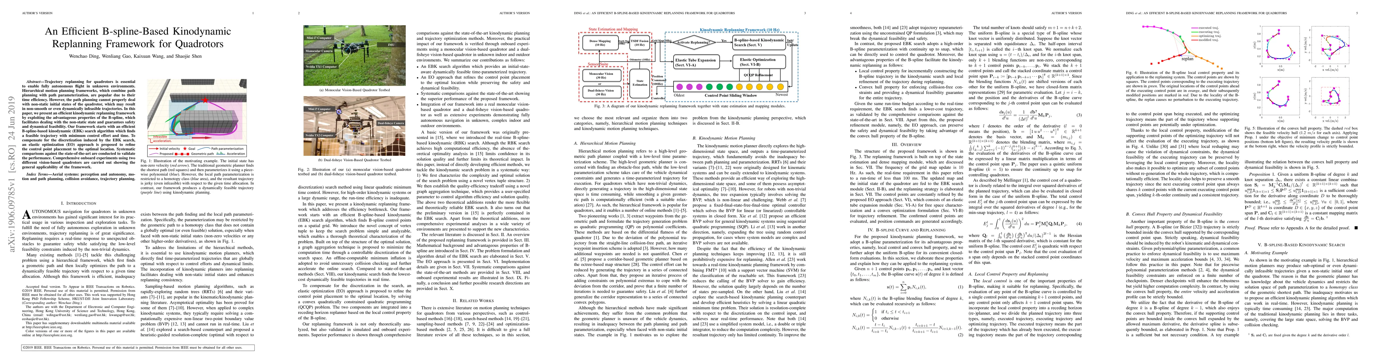 Trajectory replanning for quadrotors is essential to enable fully autonomous flight in unknown environments. Hierarchical motion planning frameworks, which combine path planning with path parameterization, are popular due to their time efficiency. However, the path planning cannot properly deal with non-static initial states of the quadrotor, which may result in non-smooth or even dynamically infeasible trajectories. In this paper, we present an efficient kinodynamic replanning framework by exploiting the advantageous properties of the B-spline, which facilitates dealing with the non-static state and guarantees safety and dynamical feasibility. Our framework starts with an efficient B-spline-based kinodynamic (EBK) search algorithm which finds a feasible trajectory with minimum control effort and time. To compensate for the discretization induced by the EBK search, an elastic optimization (EO) approach is proposed to refine the control point placement to the optimal location. Systematic comparisons against the state-of-the-art are conducted to validate the performance. Comprehensive onboard experiments using two different vision-based quadrotors are carried out showing the general applicability of the framework.