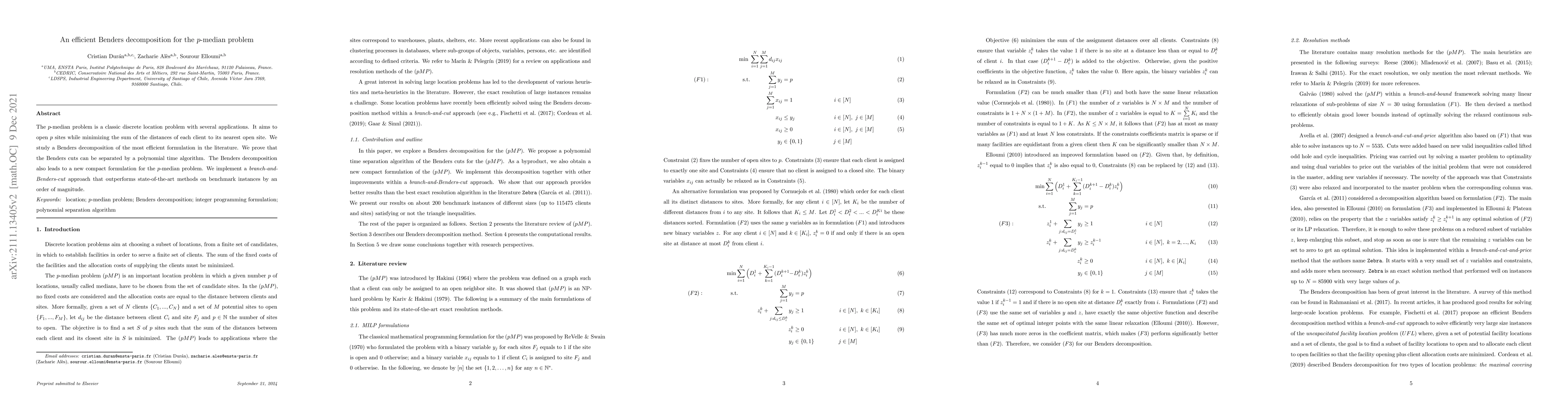 This paper presents an efficient Benders decomposition method for solving the p-median problem, demonstrating that Benders cuts can be separated in polynomial time and introducing a new compact formulation. The proposed branch-and-cut approach significantly outperforms existing methods on benchmark instances.