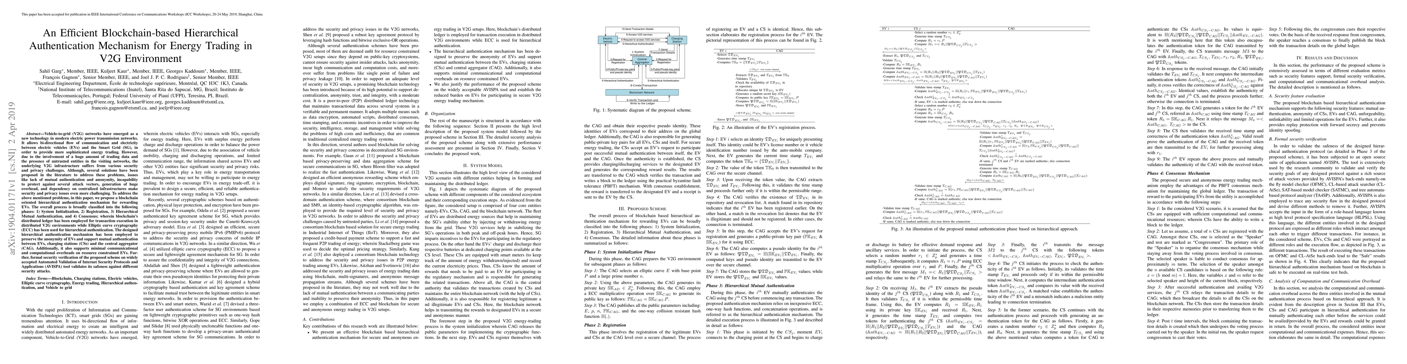 This paper proposes a blockchain-based hierarchical authentication mechanism for secure energy trading in Vehicle-to-Grid (V2G) networks, addressing mutual authentication, anonymity, and minimal overhead challenges using Elliptic Curve Cryptography (ECC) and blockchain's distributed ledger. The AVISPA tool confirms its security against various attacks.