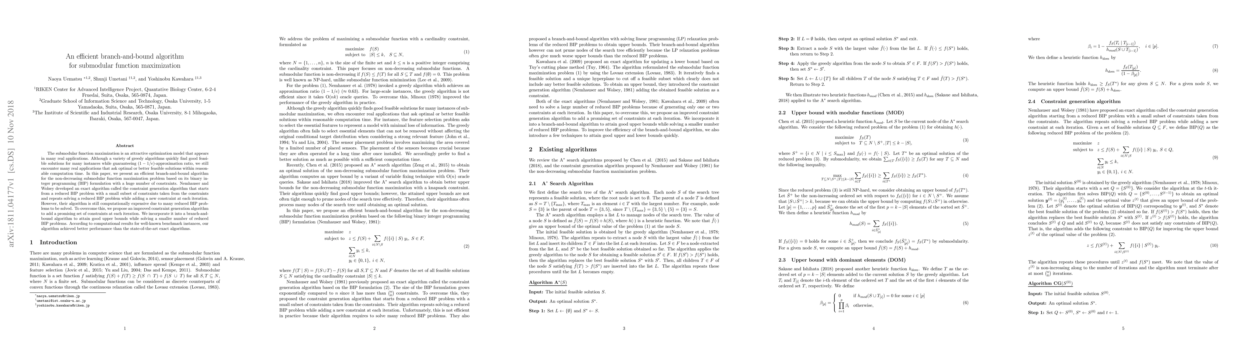 This paper introduces an efficient branch-and-bound algorithm for maximizing non-decreasing submodular functions, improving upon existing constraint generation methods. The proposed algorithm achieves better performance than state-of-the-art exact algorithms by solving a reduced number of binary integer programming problems.