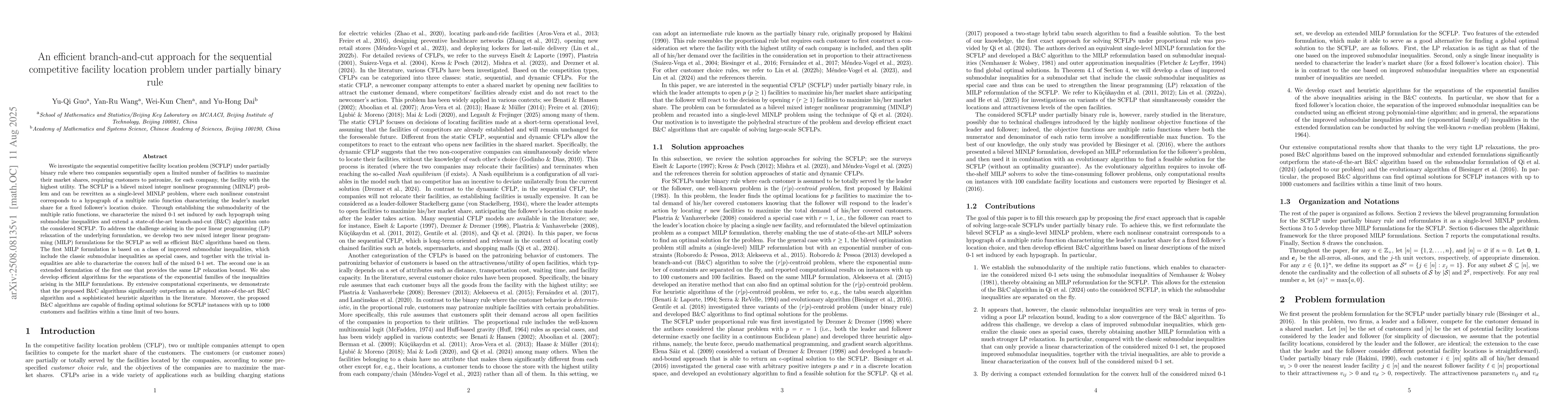 We investigate the sequential competitive facility location problem (SCFLP) under partially binary rule where two companies sequentially open a limited number of facilities to maximize their market shares, requiring customers to patronize, for each company, the facility with the highest utility. The SCFLP is a bilevel mixed integer nonlinear programming (MINLP) problem and can be rewritten as a single-level MINLP problem, where each nonlinear constraint corresponds to a hypograph of a multiple ratio function characterizing the leader's market share for a fixed follower's location choice. By establishing the submodularity of the multiple ratio functions, we characterize the mixed 0-1 set induced by each hypograph using submodular inequalities and extend a state-of-the-art branch-and-cut (B&C) algorithm to the considered SCFLP. To address the challenge of poor linear programming (LP) relaxation of the underlying formulation, we develop two new mixed integer linear programming (MILP) formulations for the SCFLP as well as efficient B&C algorithms based on them. The first MILP formulation is based on a class of improved submodular inequalities, which include the classic submodular inequalities as special cases, and together with the trivial inequalities characterize the convex hull of the mixed 0-1 set. The second one is an extended formulation of the first one that provides the same LP relaxation bound. We also develop efficient algorithms for the separations of the exponential families of the inequalities in the MILP formulations. Extensive computational experiments show that the proposed B&C algorithms significantly outperform an adapted state-of-the-art B&C algorithm and a sophisticated heuristic algorithm in the literature. Moreover, the proposed B&C algorithms can find optimal solutions for SCFLP instances with up to 1000 customers and facilities within a two-hour time limit.