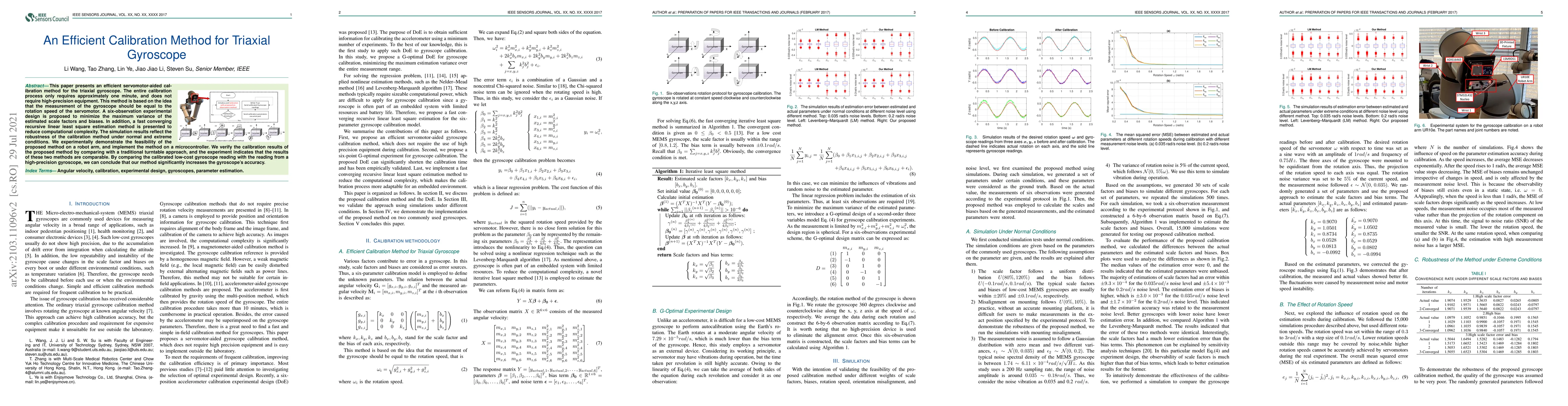 This paper introduces an efficient servomotor-aided calibration method for triaxial gyroscopes, requiring only one minute and minimal equipment, achieving comparable results to traditional methods while significantly improving gyroscope accuracy. The method employs a six-observation design and a fast converging recursive linear least square estimation to minimize computational complexity.