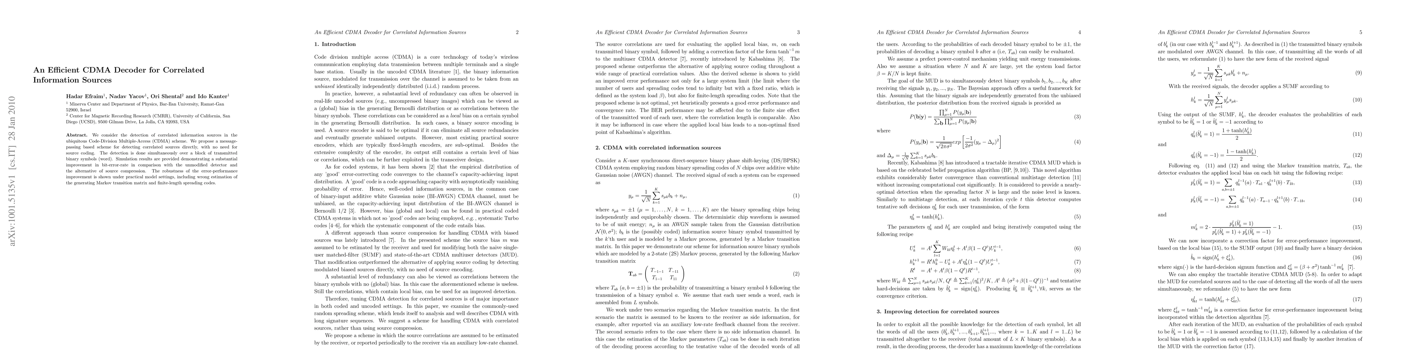 We consider the detection of correlated information sources in the ubiquitous Code-Division Multiple-Access (CDMA) scheme. We propose a message-passing based scheme for detecting correlated sources directly, with no need for source coding. The detection is done simultaneously over a block of transmitted binary symbols (word). Simulation results are provided demonstrating a substantial improvement in bit-error-rate in comparison with the unmodified detector and the alternative of source compression. The robustness of the error-performance improvement is shown under practical model settings, including wrong estimation of the generating Markov transition matrix and finite-length spreading codes.