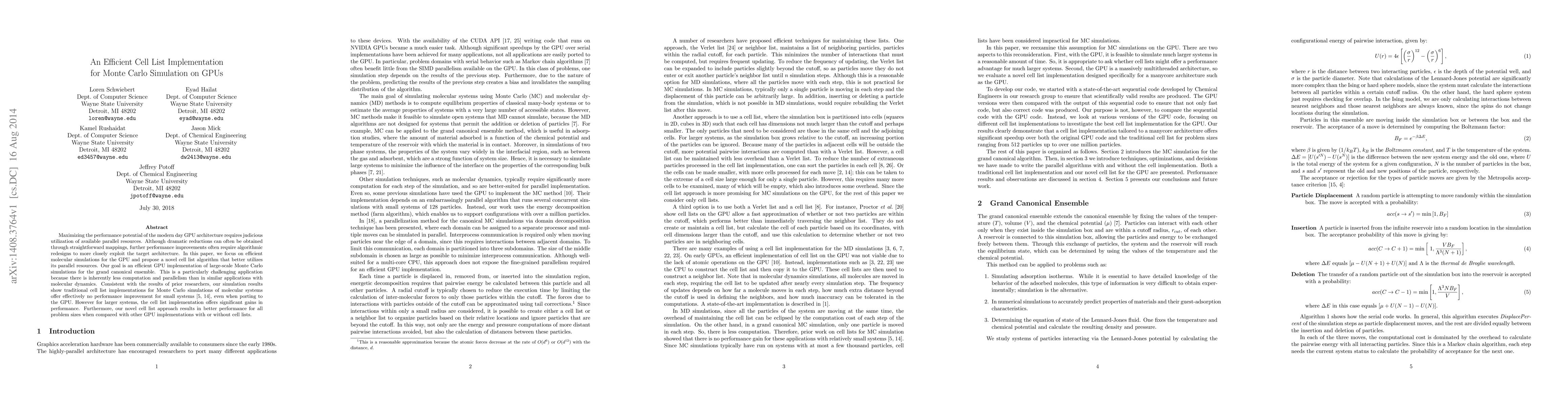 This paper proposes a novel cell list algorithm optimized for GPU architecture to enhance the performance of large-scale Monte Carlo simulations for the grand canonical ensemble. The new approach significantly improves performance for larger systems compared to traditional methods and other GPU implementations.