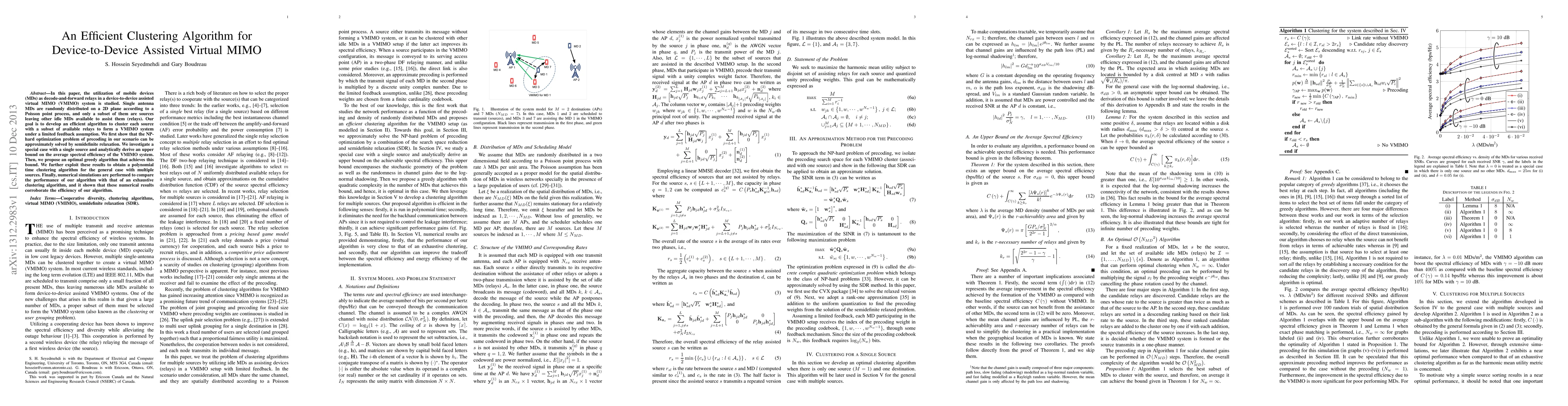 In this paper, the utilization of mobile devices (MDs) as decode-and-forward relays in a device-to-device assisted virtual MIMO (VMIMO) system is studied. Single antenna MDs are randomly distributed on a 2D plane according to a Poisson point process, and only a subset of them are sources leaving other idle MDs available to assist them (relays). Our goal is to develop an efficient algorithm to cluster each source with a subset of available relays to form a VMIMO system under a limited feedback assumption. We first show that the NP- hard optimization problem of precoding in our scenario can be approximately solved by semidefinite relaxation. We investigate a special case with a single source and analytically derive an upper bound on the average spectral efficiency of the VMIMO system. Then, we propose an optimal greedy algorithm that achieves this bound. We further exploit these results to obtain a polynomial time clustering algorithm for the general case with multiple sources. Finally, numerical simulations are performed to compare the performance of our algorithm with that of an exhaustive clustering algorithm, and it shown that these numerical results corroborate the efficiency of our algorithm.