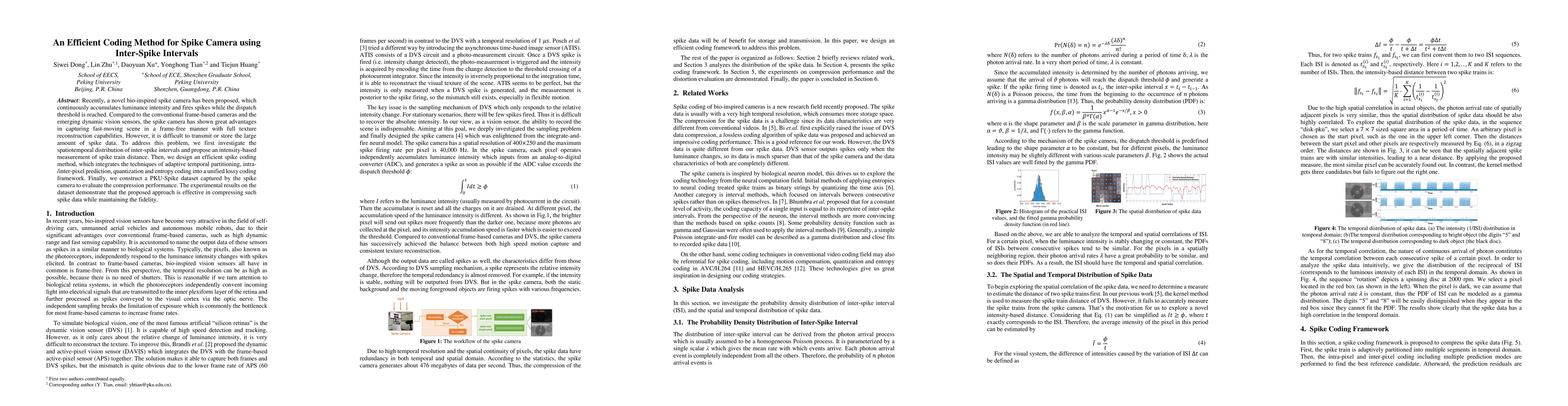 This paper proposes an efficient coding method for a spike camera that utilizes inter-spike intervals, integrating adaptive temporal partitioning, intra-/inter-pixel prediction, quantization, and entropy coding. The method effectively compresses spike data while preserving image fidelity, as demonstrated through experiments on a newly constructed PKU-Spike dataset.
