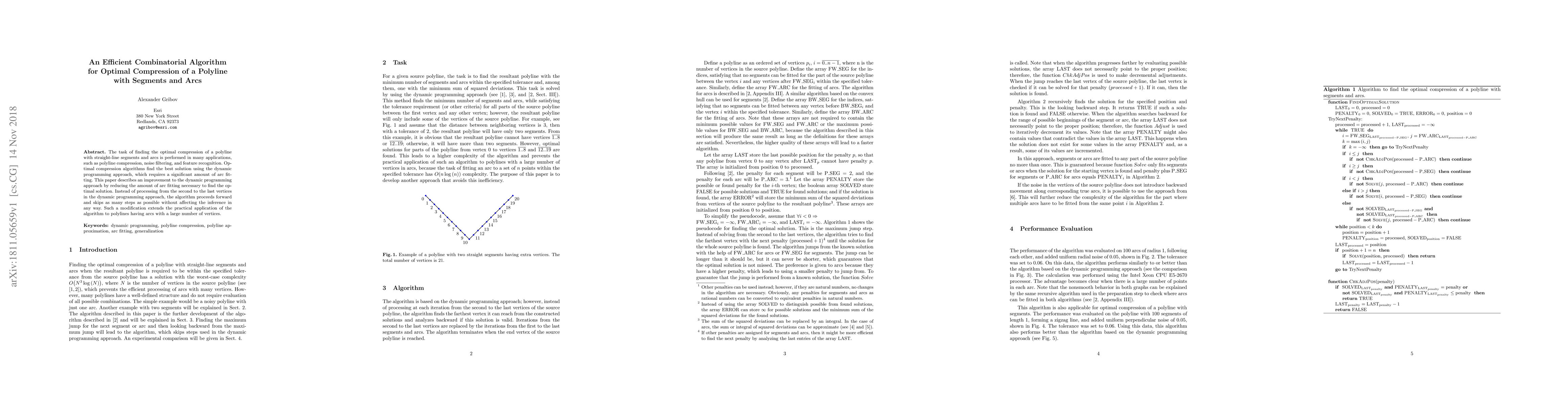 The task of finding the optimal compression of a polyline with straight-line segments and arcs is performed in many applications, such as polyline compression, noise filtering, and feature recognition. Optimal compression algorithms find the best solution using the dynamic programming approach, which requires a significant amount of arc fitting. This paper describes an improvement to the dynamic programming approach by reducing the amount of arc fitting necessary to find the optimal solution. Instead of processing from the second to the last vertices in the dynamic programming approach, the algorithm proceeds forward and skips as many steps as possible without affecting the inference in any way. Such a modification extends the practical application of the algorithm to polylines having arcs with a large number of vertices.