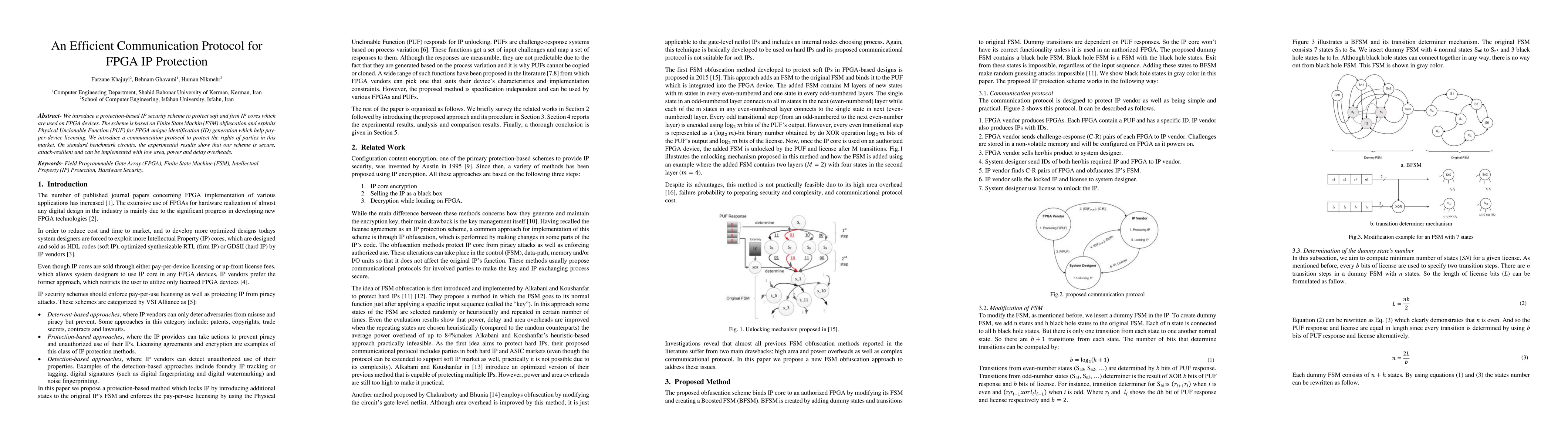 This paper proposes a secure IP protection scheme for FPGA devices using FSM obfuscation and PUF-based unique identification, along with a communication protocol to safeguard licensing rights. Experimental results demonstrate its security, resilience to attacks, and minimal implementation overhead.