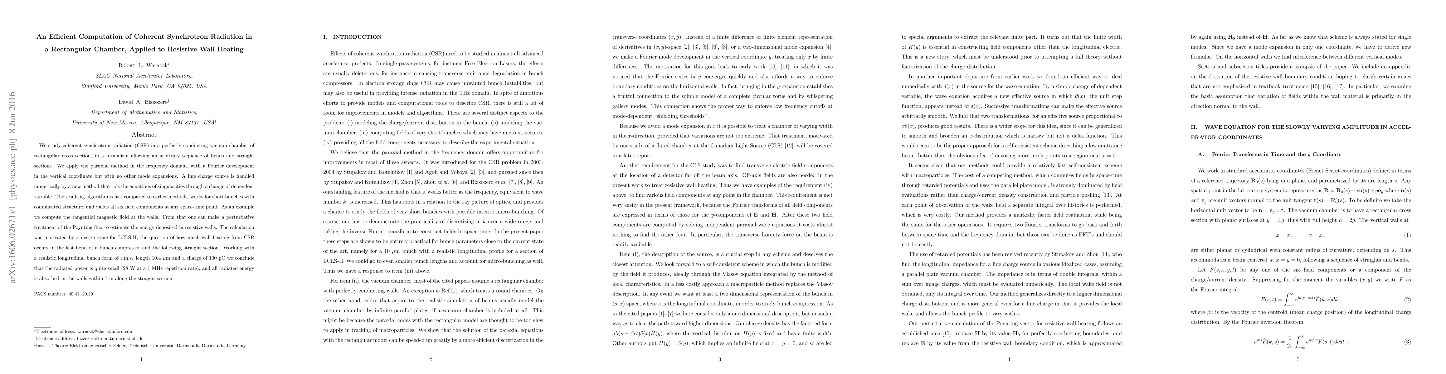 This paper presents an efficient algorithm for computing coherent synchrotron radiation in a rectangular vacuum chamber, focusing on resistive wall heating. The method handles complex bunch structures and yields accurate field components, concluding that the energy deposited in the walls is minimal for the given LCLS-II design parameters.