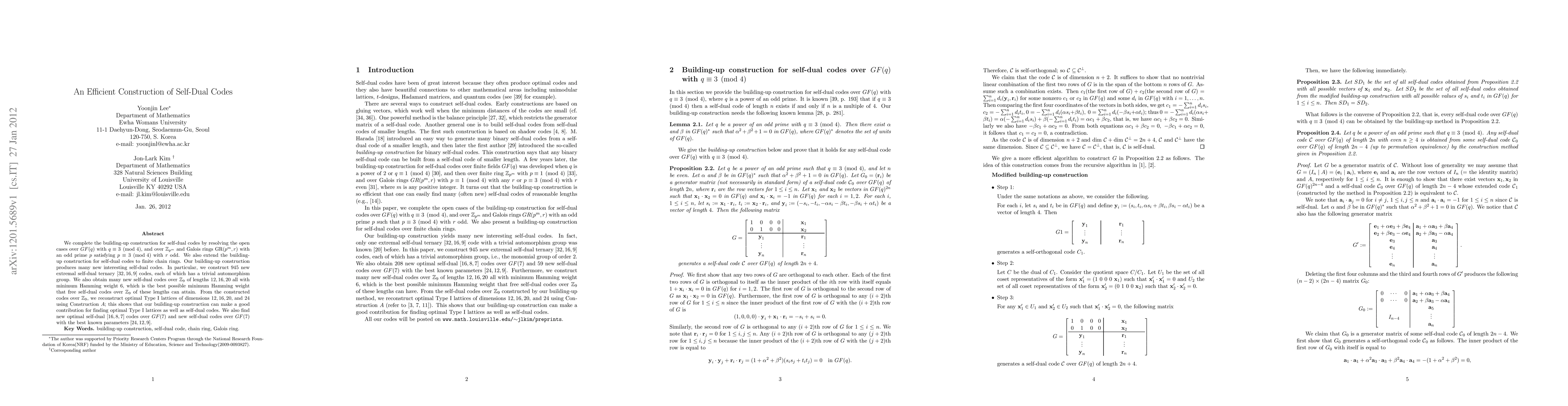 We complete the building-up construction for self-dual codes by resolving the open cases over $GF(q)$ with $q \equiv 3 \pmod 4$, and over $\Z_{p^m}$ and Galois rings $\GR(p^m,r)$ with an odd prime $p$ satisfying $p \equiv 3 \pmod 4$ with $r$ odd. We also extend the building-up construction for self-dual codes to finite chain rings. Our building-up construction produces many new interesting self-dual codes. In particular, we construct 945 new extremal self-dual ternary $[32,16,9]$ codes, each of which has a trivial automorphism group. We also obtain many new self-dual codes over $\mathbb Z_9$ of lengths $12, 16, 20$ all with minimum Hamming weight 6, which is the best possible minimum Hamming weight that free self-dual codes over $\Z_9$ of these lengths can attain. From the constructed codes over $\mathbb Z_9$, we reconstruct optimal Type I lattices of dimensions $12, 16, 20,$ and 24 using Construction $A$; this shows that our building-up construction can make a good contribution for finding optimal Type I lattices as well as self-dual codes. We also find new optimal self-dual $[16,8,7]$ codes over GF(7) and new self-dual codes over GF(7) with the best known parameters $[24,12,9]$.