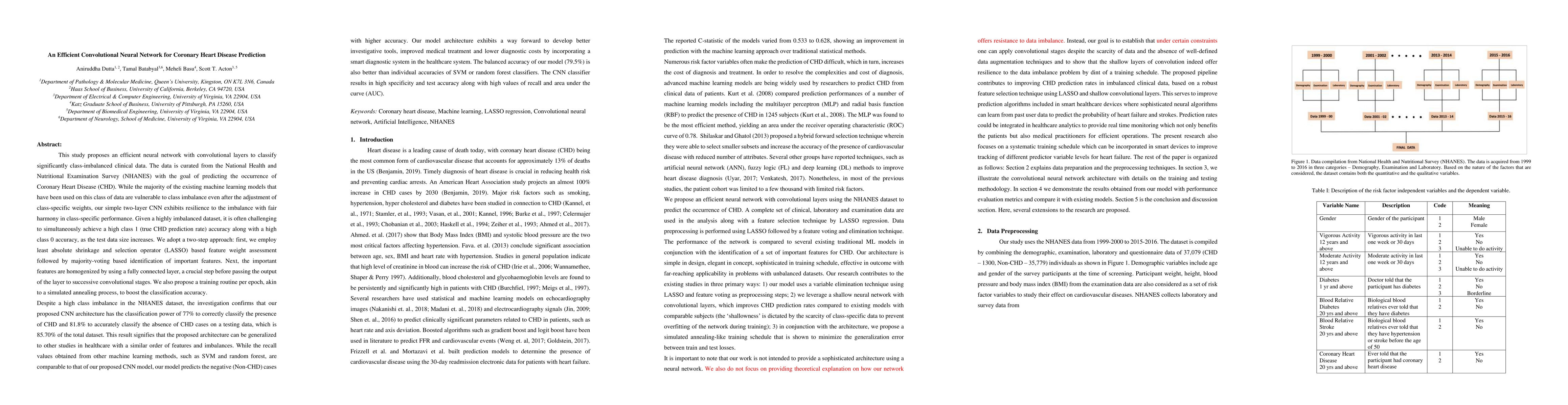 This study proposes an efficient two-layer convolutional neural network (CNN) to predict Coronary Heart Disease (CHD) from class-imbalanced clinical data from NHANES. The model demonstrates resilience to class imbalance, achieving 77% accuracy in predicting CHD and 81.8% in predicting its absence despite a 35:1 imbalance ratio.