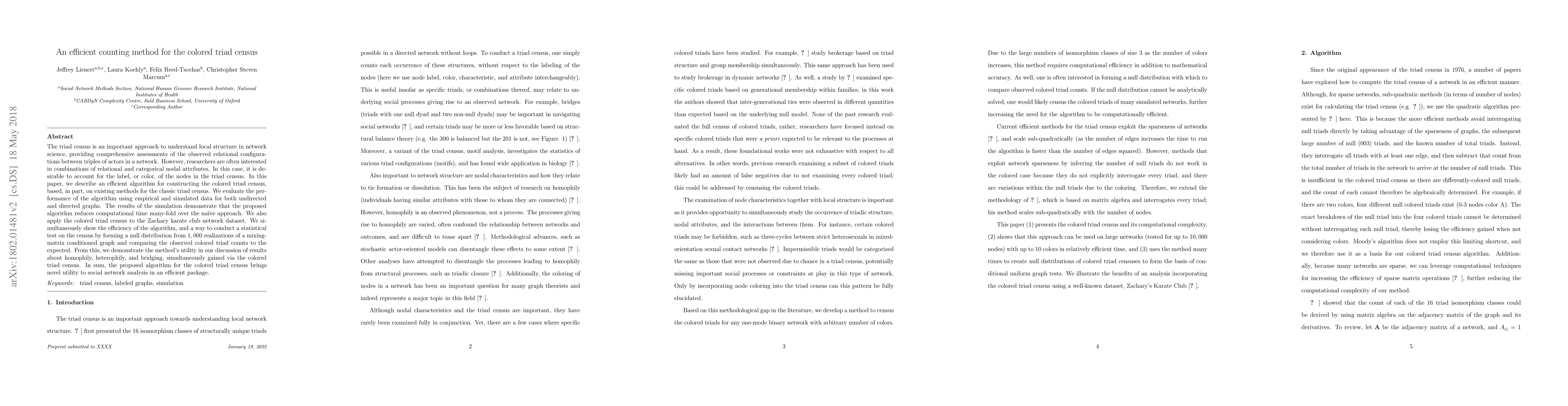 The triad census is an important approach to understand local structure in network science, providing comprehensive assessments of the observed relational configurations between triples of actors in a network. However, researchers are often interested in combinations of relational and categorical nodal attributes. In this case, it is desirable to account for the label, or color, of the nodes in the triad census. In this paper, we describe an efficient algorithm for constructing the colored triad census, based, in part, on existing methods for the classic triad census. We evaluate the performance of the algorithm using empirical and simulated data for both undirected and directed graphs. The results of the simulation demonstrate that the proposed algorithm reduces computational time many-fold over the naive approach. We also apply the colored triad census to the Zachary karate club network dataset. We simultaneously show the efficiency of the algorithm, and a way to conduct a statistical test on the census by forming a null distribution from 1,000 realizations of a mixing-matrix conditioned graph and comparing the observed colored triad counts to the expected. From this, we demonstrate the method's utility in our discussion of results about homophily, heterophily, and bridging, simultaneously gained via the colored triad census. In sum, the proposed algorithm for the colored triad census brings novel utility to social network analysis in an efficient package.