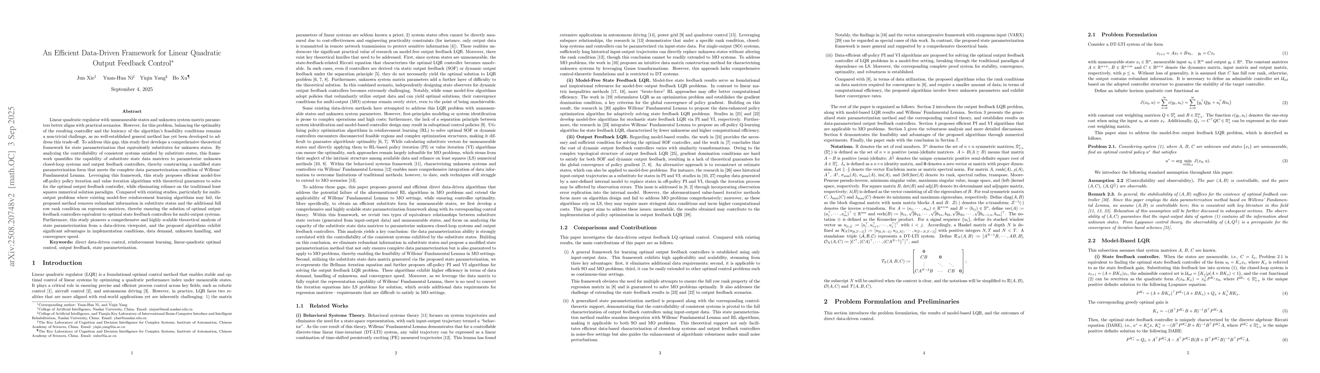 Linear quadratic regulator with unmeasurable states and unknown system matrix parameters better aligns with practical scenarios. However, for this problem, balancing the optimality of the resulting controller and the leniency of the algorithm's feasibility conditions remains a non-trivial challenge, as no well-established general method has yet been developed to address this trade-off. To address this gap, this study first develops a comprehensive theoretical framework for state parameterization that equivalently substitutes for unknown states. By analyzing the controllability of consistent systems satisfied by substitute states, this framework quantifies the capability of substitute state data matrices to parameterize unknown closed-loop systems and output feedback controllers, thereby constructing a modified state parameterization form that meets the complete data parameterization condition of Willems' Fundamental Lemma. Leveraging this framework, this study proposes efficient model-free off-policy policy iteration and value iteration algorithms with theoretical guarantees to solve for the optimal output feedback controller. Compared with existing studies, particularly for multi-output problems where existing model-free reinforcement learning algorithms may fail, the proposed method removes redundant information in substitute states and the additional full row rank condition on regression matrices, thereby ensuring the solution of optimal output feedback controllers equivalent to optimal state feedback controllers for multi-output systems. Furthermore, this study pioneers a comprehensive and highly scalable theoretical analysis of state parameterization from a data-driven viewpoint, and the proposed algorithms exhibit significant advantages in implementation conditions, data demand, unknown handling, and convergence speed.