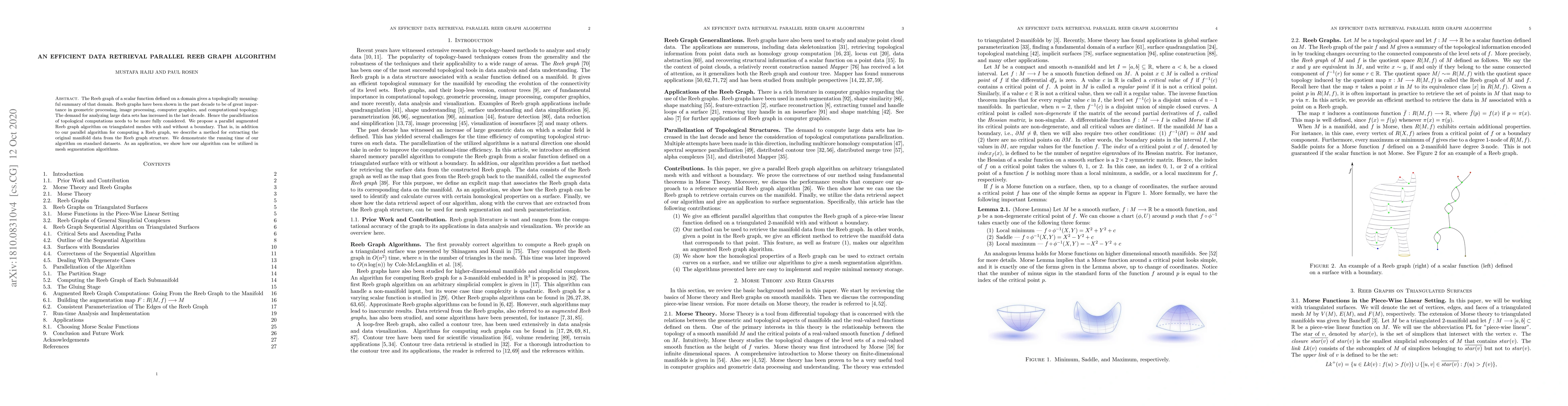 This paper proposes a parallel algorithm for computing Reeb graphs on triangulated meshes, enhancing topological data analysis for large datasets. It also introduces a method for retrieving original manifold data from the Reeb graph, demonstrating its efficiency and application in mesh segmentation.