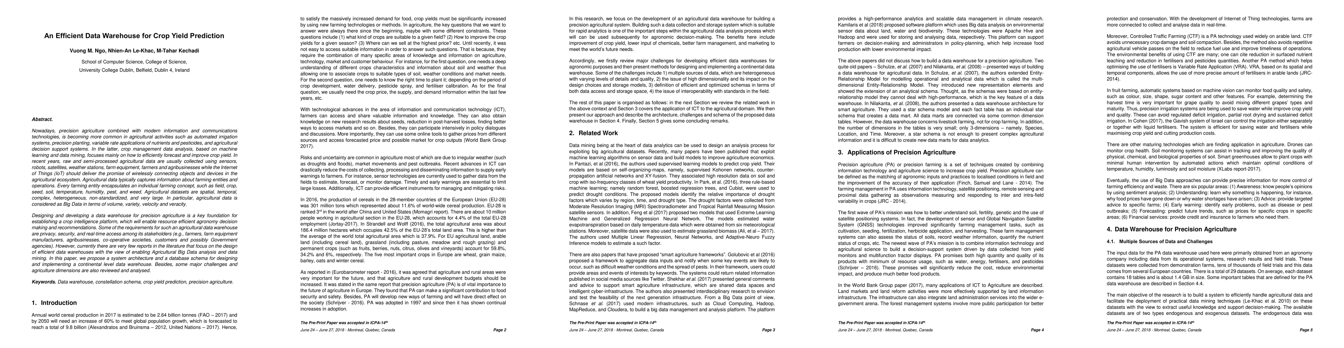 A study designed an efficient data warehouse for crop yield prediction in precision agriculture, addressing Big Data analysis and security requirements. The paper aims to enable resource-efficient agronomy decision making and recommendations.
