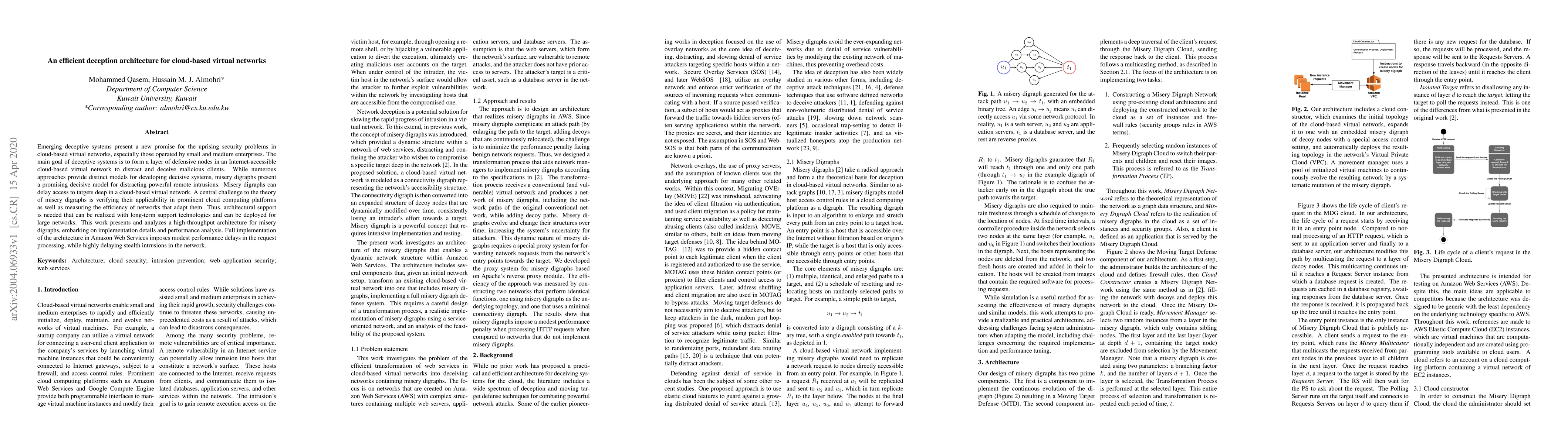 This paper proposes an efficient deception architecture for cloud-based virtual networks using misery digraphs to create defensive nodes that distract and delay malicious intrusions. The architecture, implemented in Amazon Web Services, shows modest performance delays but significantly enhances intrusion deterrence.