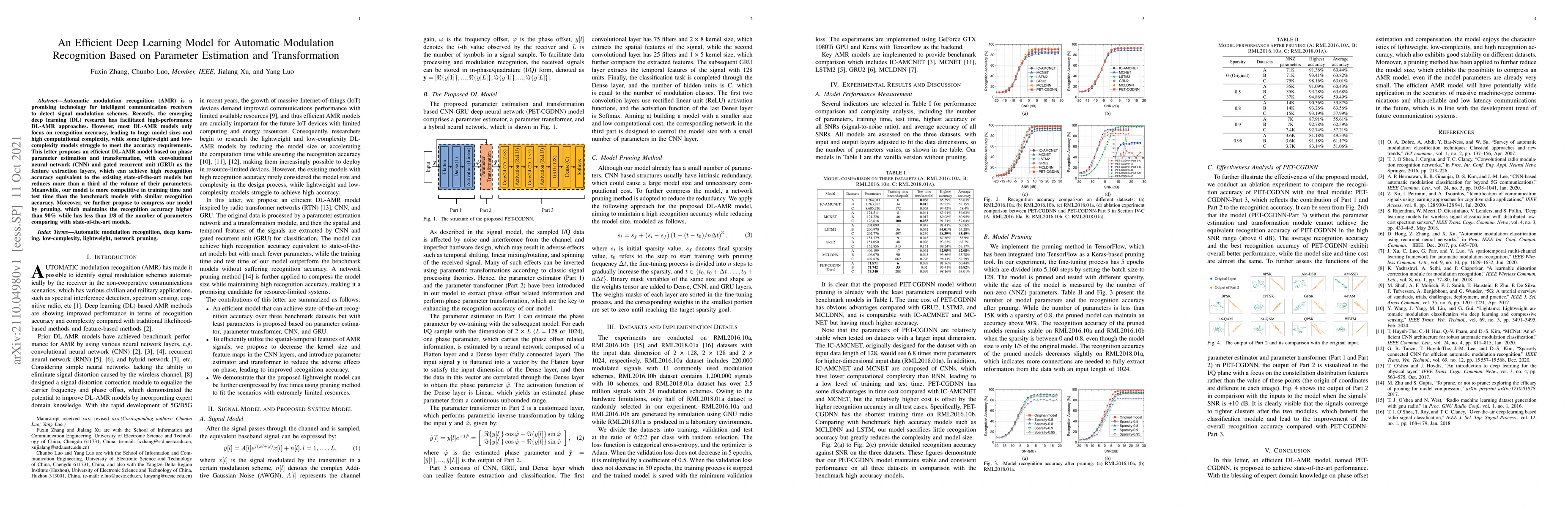 This paper proposes an efficient deep learning model for automatic modulation recognition (AMR) that combines convolutional neural networks (CNN) and gated recurrent units (GRU) to achieve high recognition accuracy while significantly reducing model size and computational complexity. The model also demonstrates effective compression through pruning, maintaining over 90% accuracy with less than 1/8 of the parameters compared to state-of-the-art models.