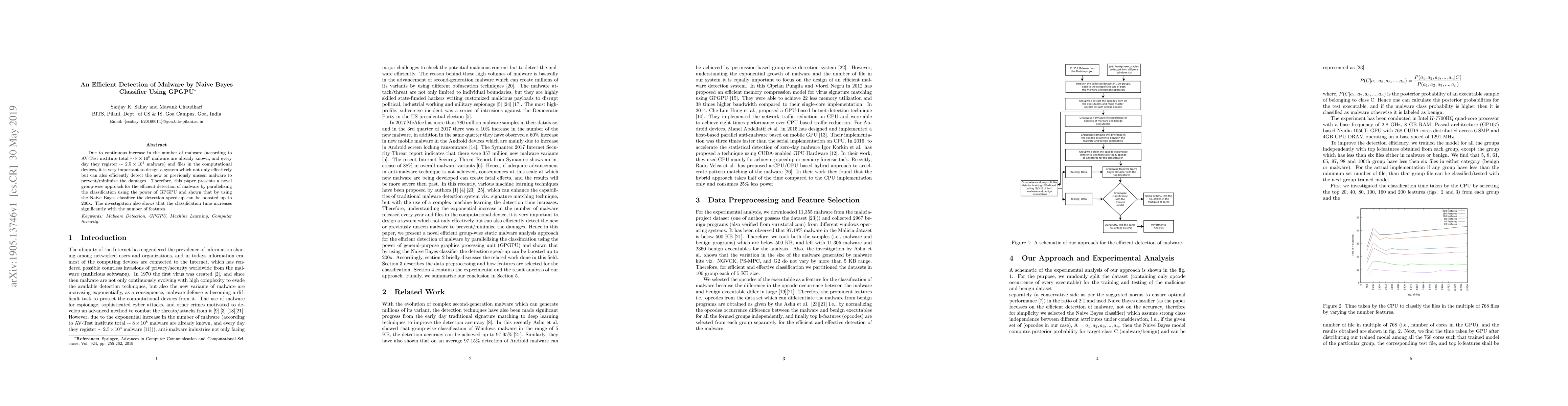 This paper proposes a novel group-wise approach for efficient malware detection using a Naive Bayes classifier parallelized on GPGPU, achieving up to a 200x speed-up in detection. The study highlights that classification time increases with the number of features.
