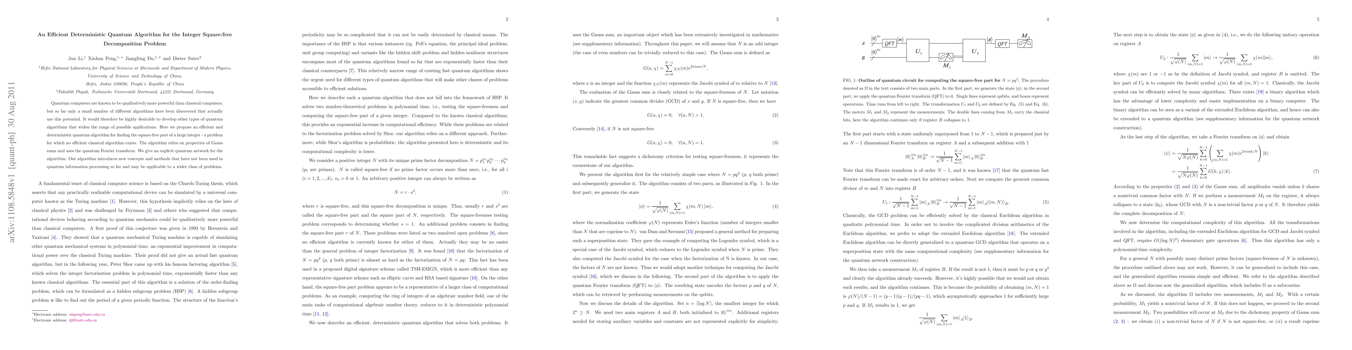 The paper proposes an efficient deterministic quantum algorithm for finding the square-free part of a large integer, utilizing properties of Gauss sums and the quantum Fourier transform, with an explicit quantum network for the algorithm.