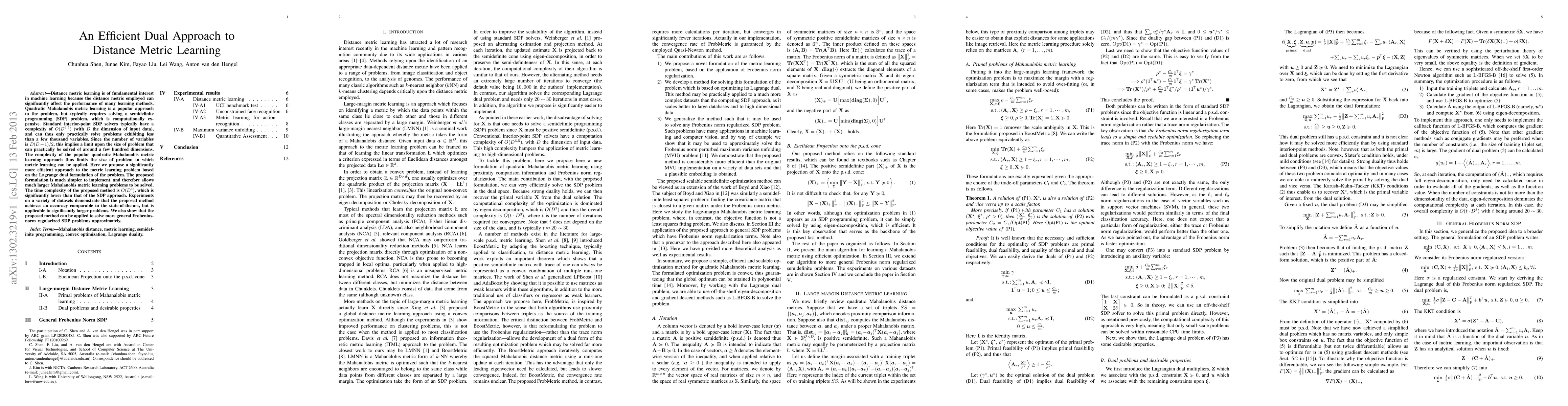 This paper proposes an efficient dual approach for distance metric learning based on the Lagrange dual formulation, significantly reducing computational complexity from $O(D^{6.5})$ to $O(D^3)$, allowing it to handle larger datasets compared to traditional semidefinite programming methods. Experiments show comparable accuracy to the state-of-the-art while extending the method's applicability to larger problems.