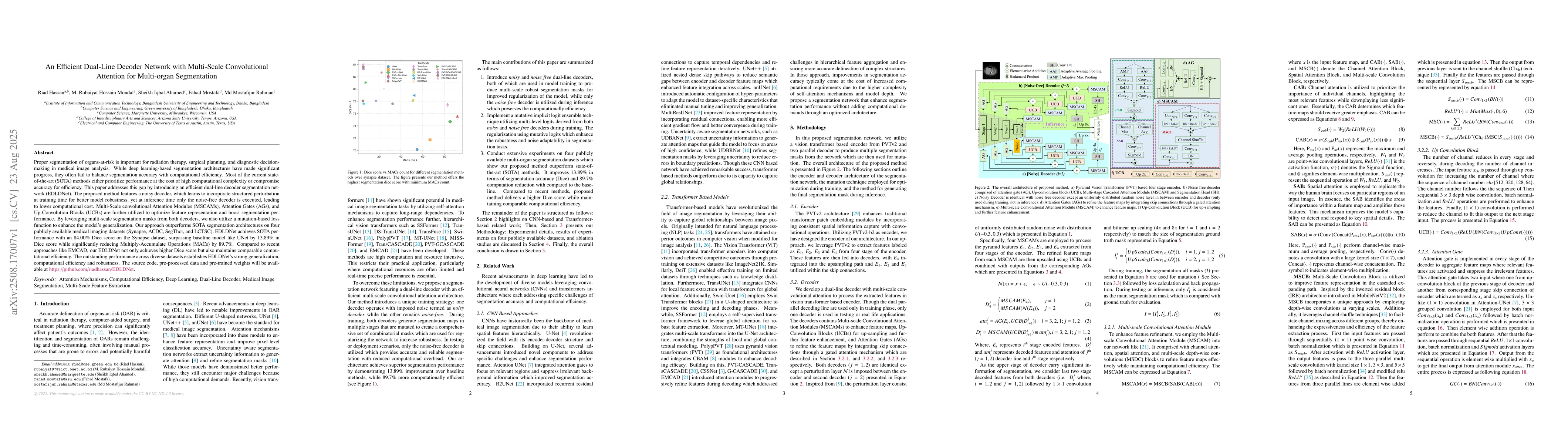 Proper segmentation of organs-at-risk is important for radiation therapy, surgical planning, and diagnostic decision-making in medical image analysis. While deep learning-based segmentation architectures have made significant progress, they often fail to balance segmentation accuracy with computational efficiency. Most of the current state-of-the-art methods either prioritize performance at the cost of high computational complexity or compromise accuracy for efficiency. This paper addresses this gap by introducing an efficient dual-line decoder segmentation network (EDLDNet). The proposed method features a noisy decoder, which learns to incorporate structured perturbation at training time for better model robustness, yet at inference time only the noise-free decoder is executed, leading to lower computational cost. Multi-Scale convolutional Attention Modules (MSCAMs), Attention Gates (AGs), and Up-Convolution Blocks (UCBs) are further utilized to optimize feature representation and boost segmentation performance. By leveraging multi-scale segmentation masks from both decoders, we also utilize a mutation-based loss function to enhance the model's generalization. Our approach outperforms SOTA segmentation architectures on four publicly available medical imaging datasets. EDLDNet achieves SOTA performance with an 84.00% Dice score on the Synapse dataset, surpassing baseline model like UNet by 13.89% in Dice score while significantly reducing Multiply-Accumulate Operations (MACs) by 89.7%. Compared to recent approaches like EMCAD, our EDLDNet not only achieves higher Dice score but also maintains comparable computational efficiency. The outstanding performance across diverse datasets establishes EDLDNet's strong generalization, computational efficiency, and robustness. The source code, pre-processed data, and pre-trained weights will be available at https://github.com/riadhassan/EDLDNet .