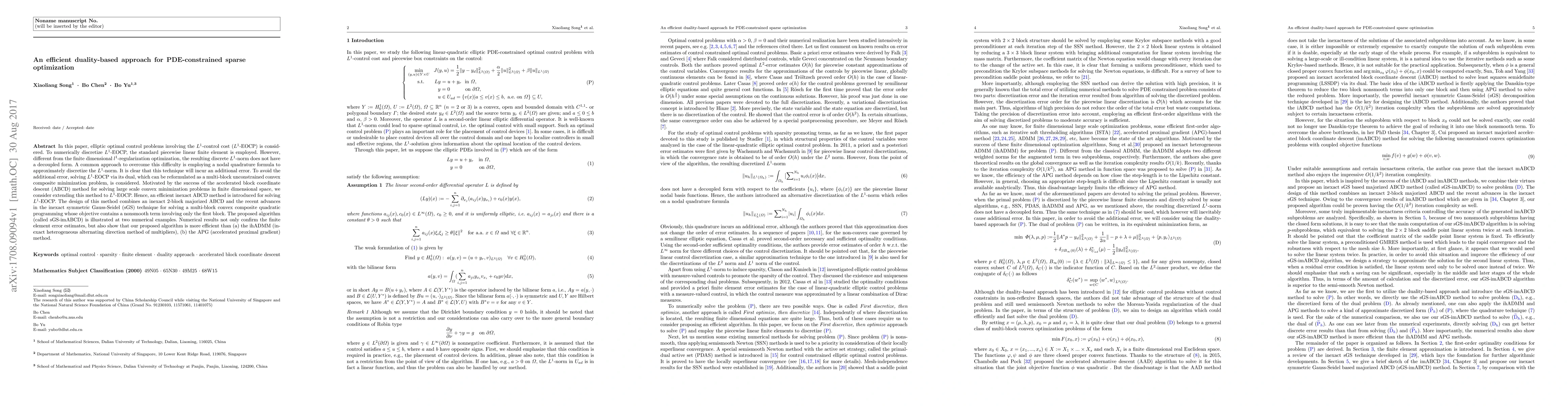 This research introduces an efficient duality-based approach for solving PDE-constrained sparse optimization problems, specifically $L^1$-EOCP (elliptic optimal control problems with $L^1$-control cost). The method, called sGS-imABCD, extends the accelerated block coordinate descent (ABCD) technique to handle multi-block unconstrained convex composite minimization problems. It combines an inexact 2-block majorized ABCD with recent inexact symmetric Gauss-Seidel (sGS) advances. Numerical examples demonstrate the proposed algorithm's efficiency compared to ihADMM and APG methods, confirming finite element error estimates.