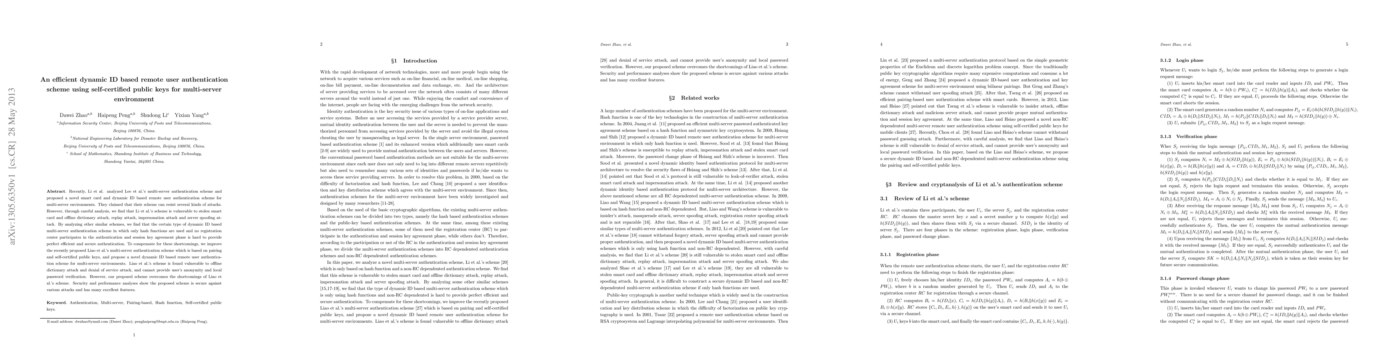 This paper critiques existing multi-server authentication schemes, identifying vulnerabilities in schemes by Li et al. and Liao et al. It proposes an improved dynamic ID-based remote user authentication scheme using self-certified public keys, claiming enhanced security against various attacks and better performance.