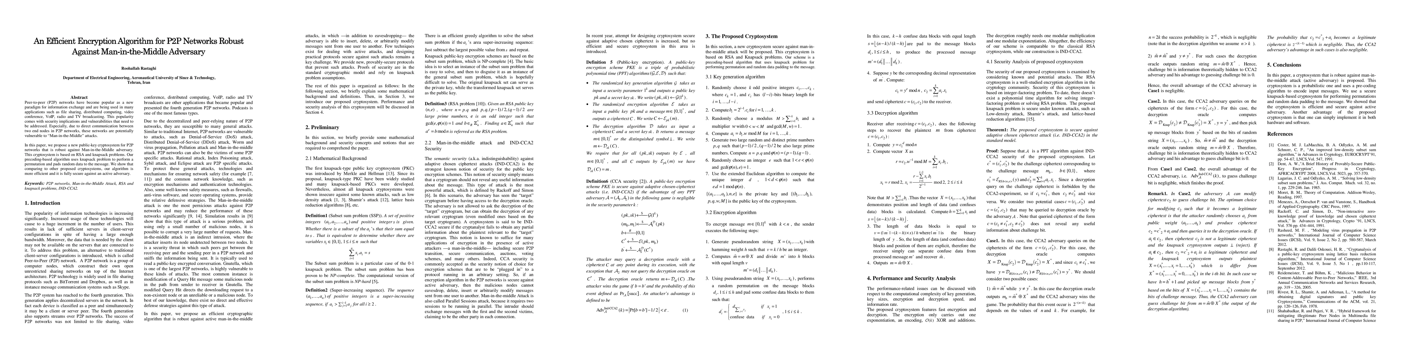 This paper proposes a new public-key cryptosystem for P2P networks based on RSA and knapsack problems to robustly counter Man-in-the-Middle attacks. The precoding-based algorithm is shown to be more efficient and fully secure compared to existing cryptosystems.