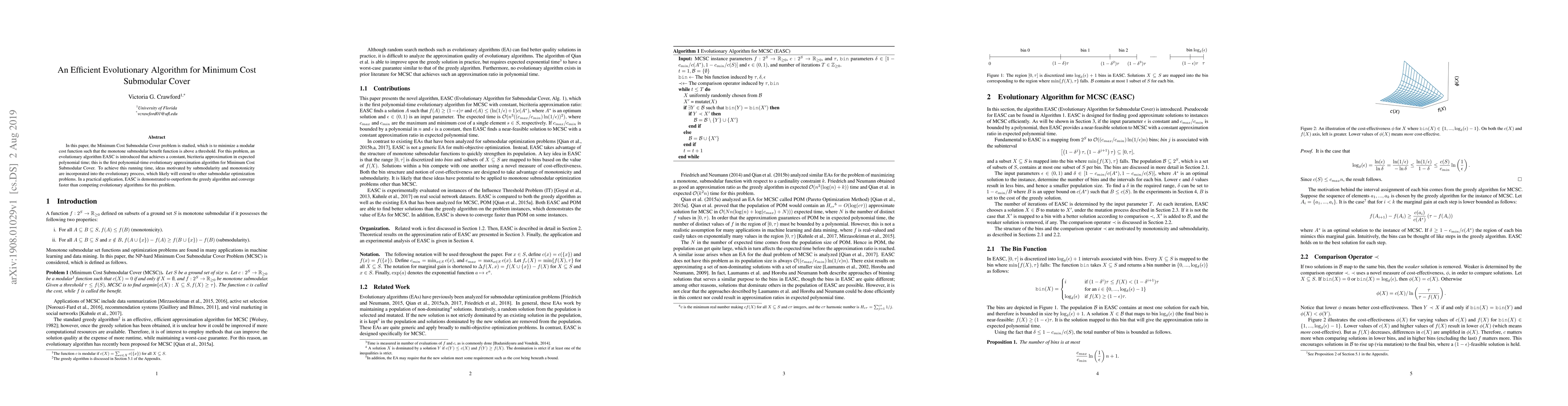 This paper introduces an evolutionary algorithm EASC for the Minimum Cost Submodular Cover problem, achieving a constant bicriteria approximation in expected polynomial time. The algorithm outperforms greedy and other evolutionary methods in practical applications.