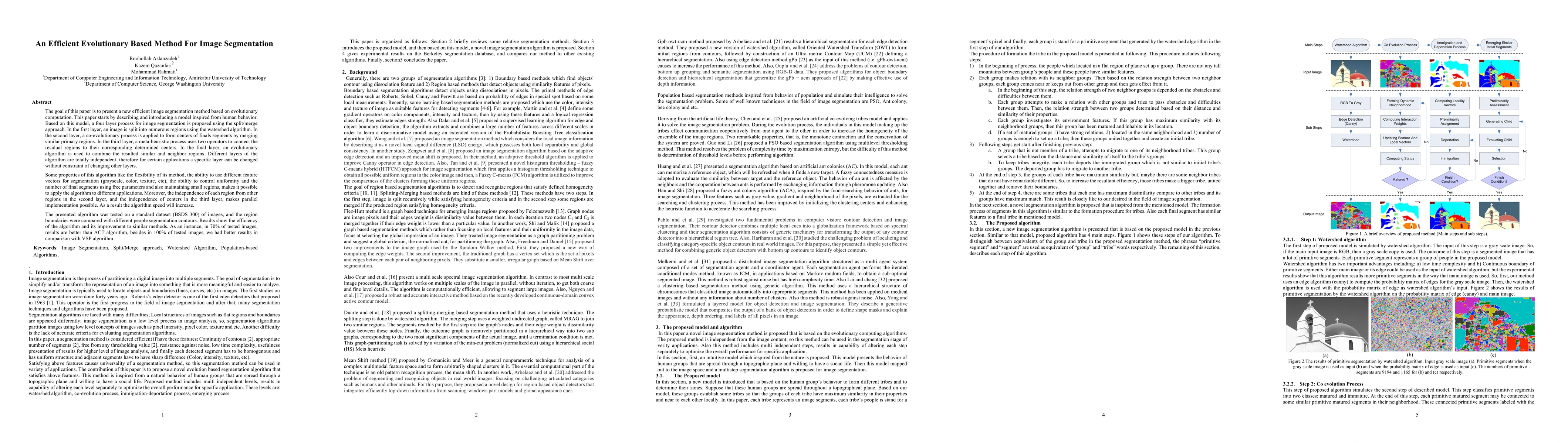 The goal of this paper is to present a new efficient image segmentation method based on evolutionary computation which is a model inspired from human behavior. Based on this model, a four layer process for image segmentation is proposed using the split/merge approach. In the first layer, an image is split into numerous regions using the watershed algorithm. In the second layer, a co-evolutionary process is applied to form centers of finals segments by merging similar primary regions. In the third layer, a meta-heuristic process uses two operators to connect the residual regions to their corresponding determined centers. In the final layer, an evolutionary algorithm is used to combine the resulted similar and neighbor regions. Different layers of the algorithm are totally independent, therefore for certain applications a specific layer can be changed without constraint of changing other layers. Some properties of this algorithm like the flexibility of its method, the ability to use different feature vectors for segmentation (grayscale, color, texture, etc), the ability to control uniformity and the number of final segments using free parameters and also maintaining small regions, makes it possible to apply the algorithm to different applications. Moreover, the independence of each region from other regions in the second layer, and the independence of centers in the third layer, makes parallel implementation possible. As a result the algorithm speed will increase. The presented algorithm was tested on a standard dataset (BSDS 300) of images, and the region boundaries were compared with different people segmentation contours. Results show the efficiency of the algorithm and its improvement to similar methods. As an instance, in 70% of tested images, results are better than ACT algorithm, besides in 100% of tested images, we had better results in comparison with VSP algorithm.