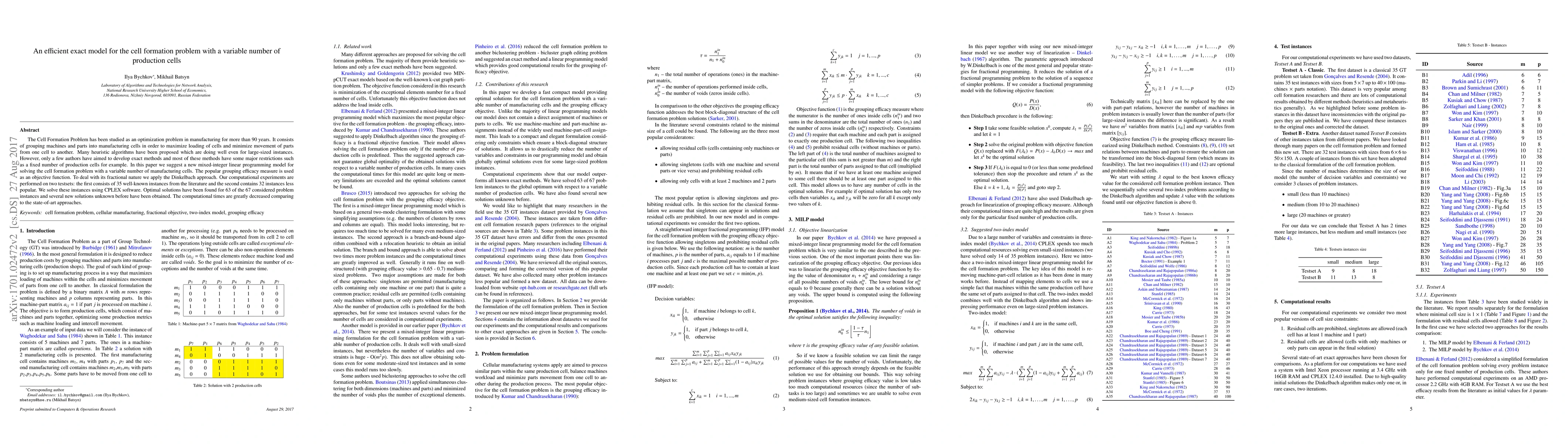 This paper proposes a new mixed-integer linear programming model to solve the cell formation problem with variable production cells, using the Dinkelbach approach to handle the objective function's fractional nature. Computational results show optimal solutions for most instances and significantly reduced computation times compared to existing methods.