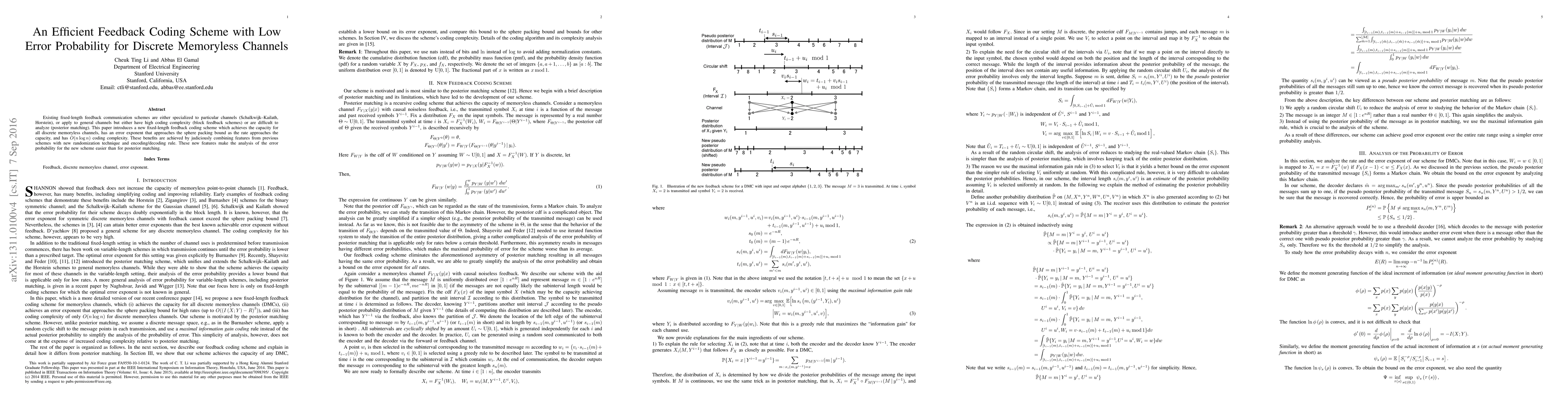 This paper proposes a novel fixed-length feedback coding scheme that achieves capacity for all discrete memoryless channels with low error probability and $O(n\log n)$ coding complexity, combining features from existing schemes with a new randomization technique for easier analysis.
