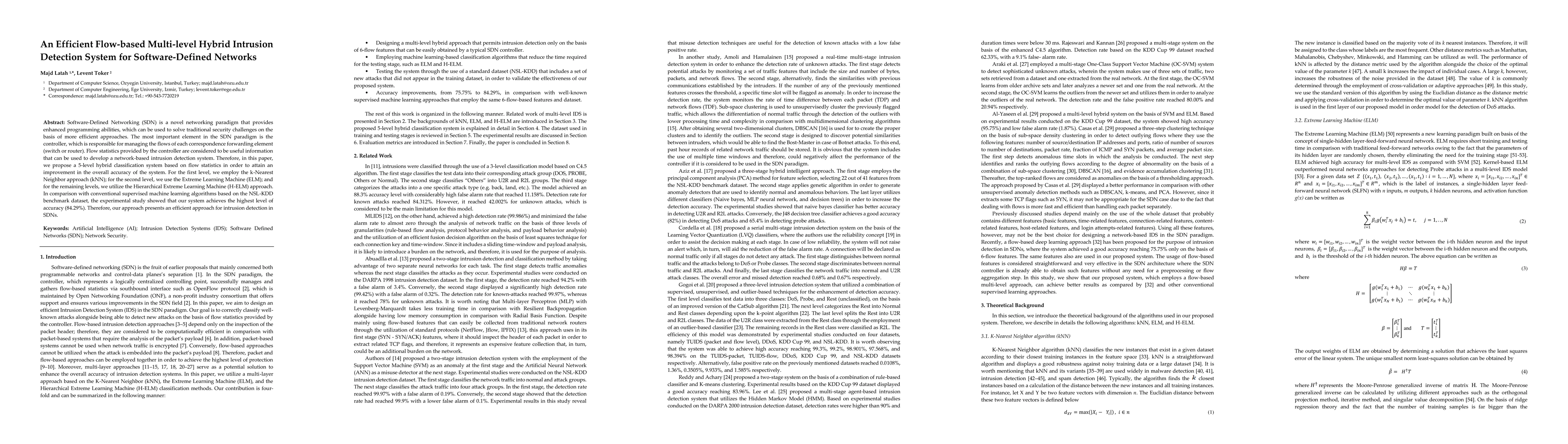 This paper proposes a 5-level hybrid intrusion detection system for Software-Defined Networks (SDN) using flow statistics, combining k-Nearest Neighbor, Extreme Learning Machine, and Hierarchical Extreme Learning Machine for improved accuracy. Experimental results show an 84.29% accuracy, outperforming conventional supervised machine learning methods.