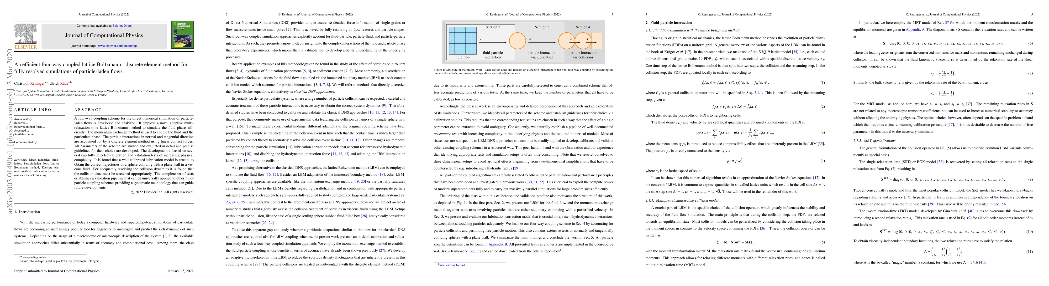 This paper presents a four-way coupled lattice Boltzmann-discrete element method for simulating particle-laden flows, employing adaptive multi-relaxation time lattice Boltzmann for fluid dynamics and discrete element methods for particle interactions. The study provides guidelines for parameter selection and establishes a validation pipeline for future fluid-particle coupling schemes.