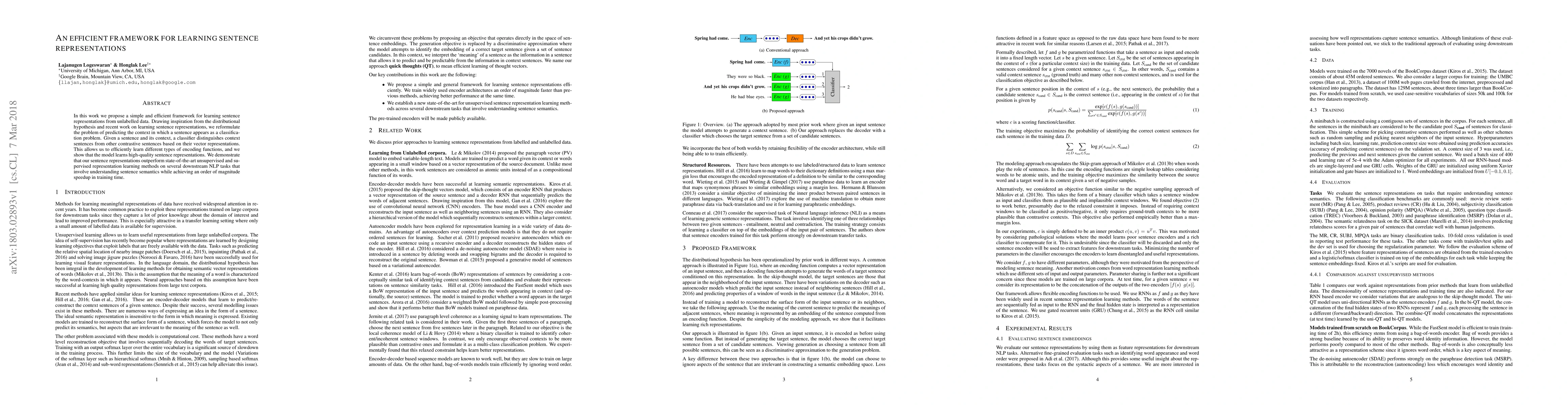 This paper introduces a framework for learning efficient sentence representations from unlabelled data, reformulating context prediction as a classification problem. The proposed method achieves high-quality sentence representations, outperforms existing methods, and significantly speeds up training time for various downstream NLP tasks.